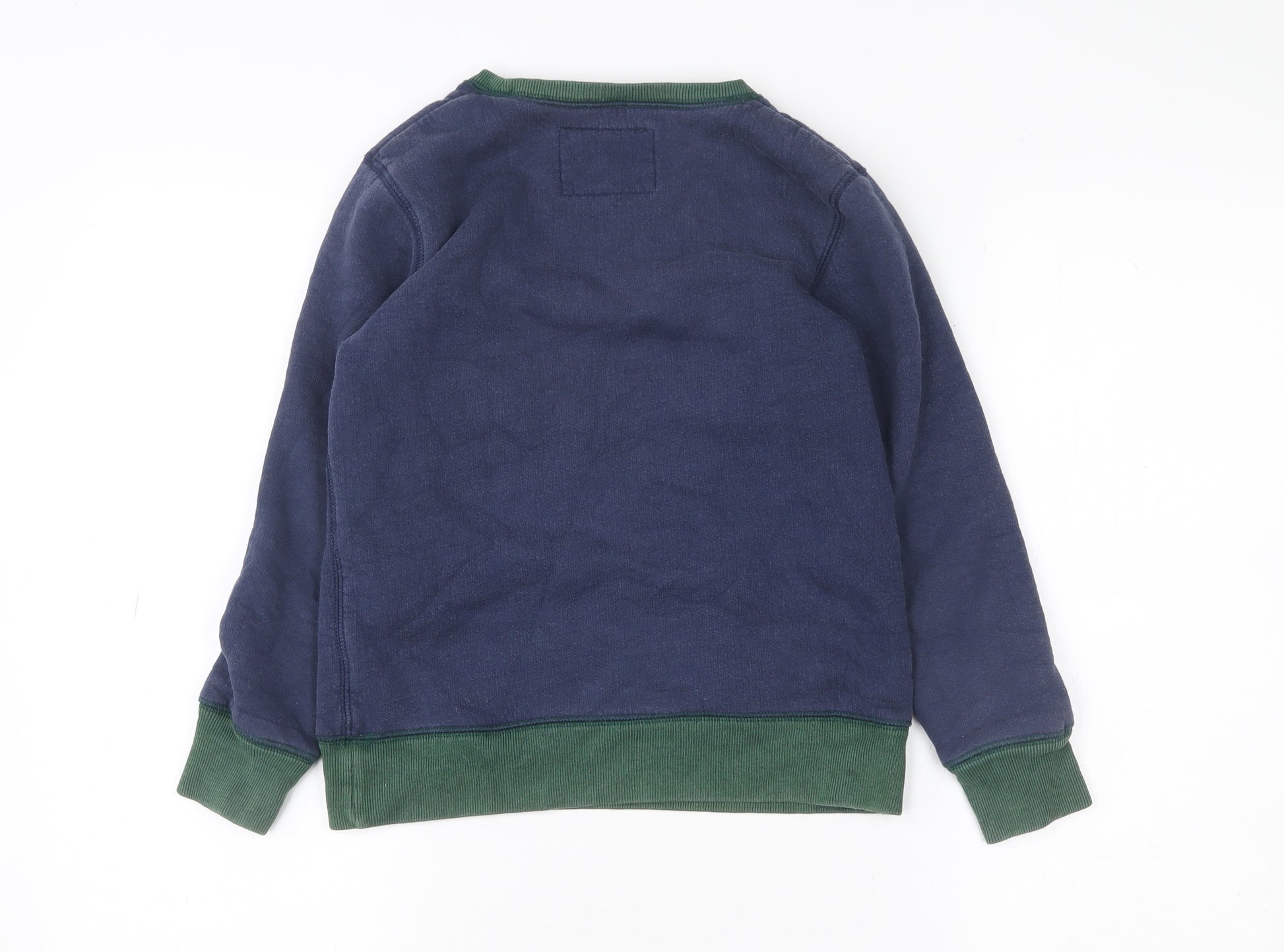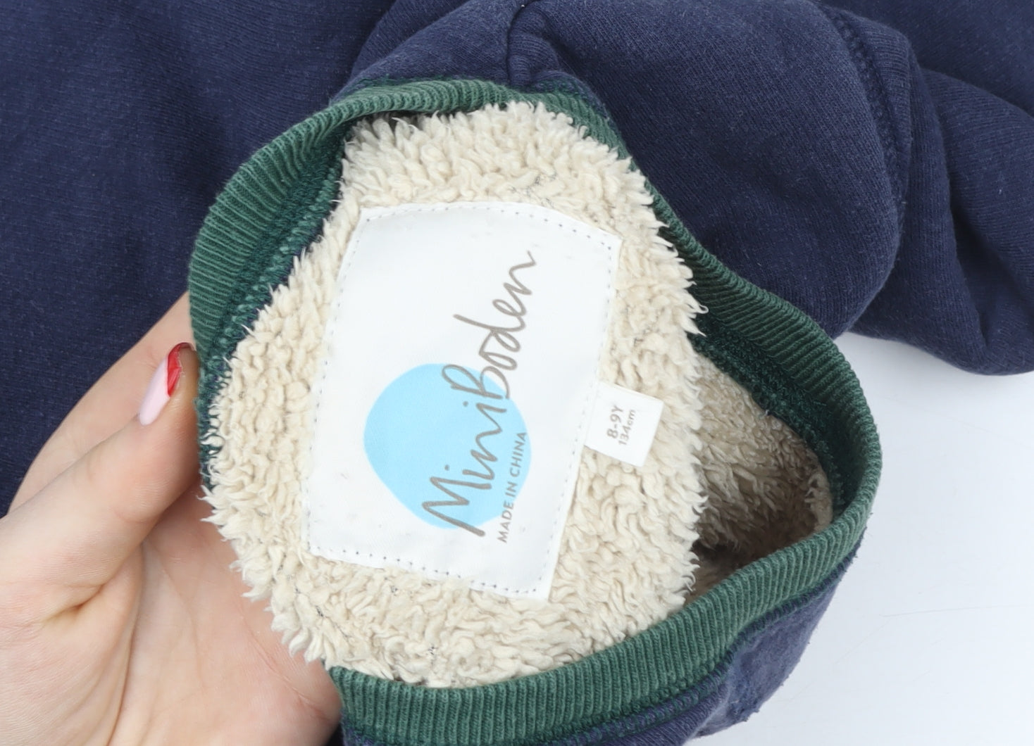 Keep your young one warm and stylish this season with this Mini Boden Boys Fleece Lined Sweatshirt. Designed for everyday comfort and play, this cosy pullover blends practicality with timeless British style. The sweatshirt comes in a classic navy blue hue, complemented by contrasting forest green ribbed cuffs, hem, and neckline for a refined yet playful finish. Perfect for layering during the colder months, its soft fleece lining provides added warmth while remaining breathable, ensuring comfort throughout the day. The garment features a simple, crew neck design, providing ease of wear and pairing effortlessly with jeans, joggers, or casual trousers. Constructed from a high-quality cotton and polyester blend, this sweatshirt feels soft against the skin while maintaining durability wash after wash. Its long sleeves and regular fit make it a great choice for school, weekend outings, or outdoor play. Suitable for boys aged 8-9 years, the sweatshirt measures approximately 70cm across the chest and 60cm in length, offering a comfortable fit with plenty of room for movement. Mini Boden’s reputation for quality craftsmanship shows through in every detail—from the neatly stitched seams to the fleece interior designed to keep your child snug on chilly days. With a pull-on closure, this sweatshirt is an easy, fuss-free choice for busy mornings. Whether layered over a t-shirt in autumn or worn under a coat during winter, this fleece-lined crew neck sweatshirt will quickly become a wardrobe favourite. Ideal for casual wear, it offers both warmth and durability for active kids. In very good pre-loved condition, this item shows minimal signs of previous use with no stains, tears, or marks. A versatile, stylish, and practical addition to any boy’s wardrobe, perfect for the playground, weekend adventures, or simply lounging at home.