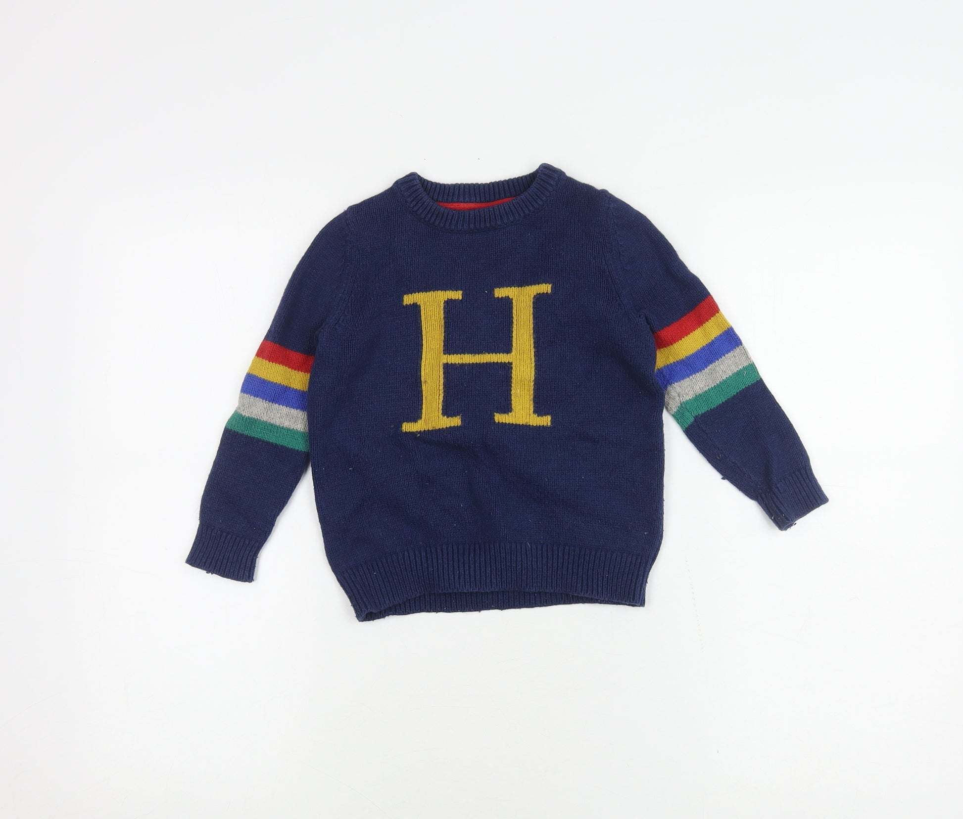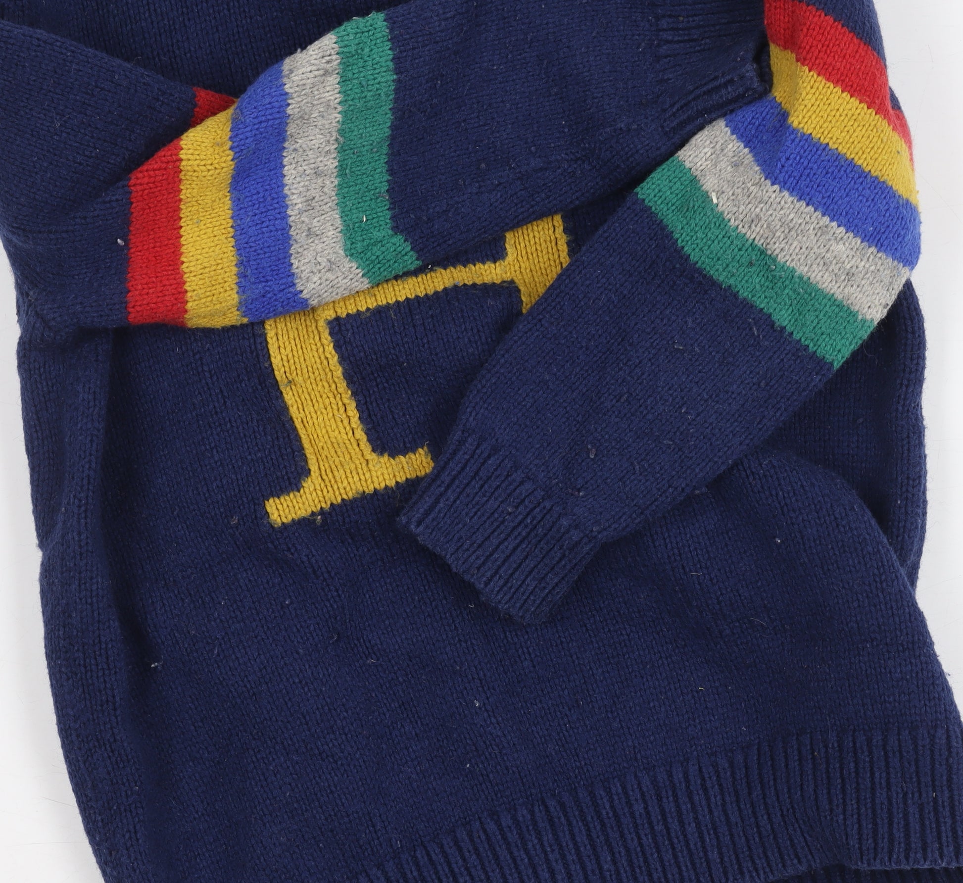 Delight your little wizard with this charming Harry Potter-themed pullover jumper from Mini Boden. Designed for boys, this vibrant blue jumper features a large ‘H’ emblazoned across the front, proudly representing Hogwarts. Crafted from a blend of cotton, polyamide, and wool, it offers both comfort and warmth, making it ideal for autumn and winter wear. The sleeves flaunt a colourful striped pattern, adding a playful touch that’s sure to excite any young fan. With its crew neck and long sleeves, the jumper provides a snug fit that ensures cosiness on all casual occasions. Easy to care for, this machine washable piece promises convenience for busy parents. Whether worn for school, casual outings, or just lounging at home, this jumper is a versatile addition to your child’s wardrobe. Despite minor signs of wear, it remains in excellent condition, ready to be a favourite item. Capture the magical appeal of Harry Potter with this unique and stylish Mini Boden jumper that celebrates one of the most beloved characters in literature.