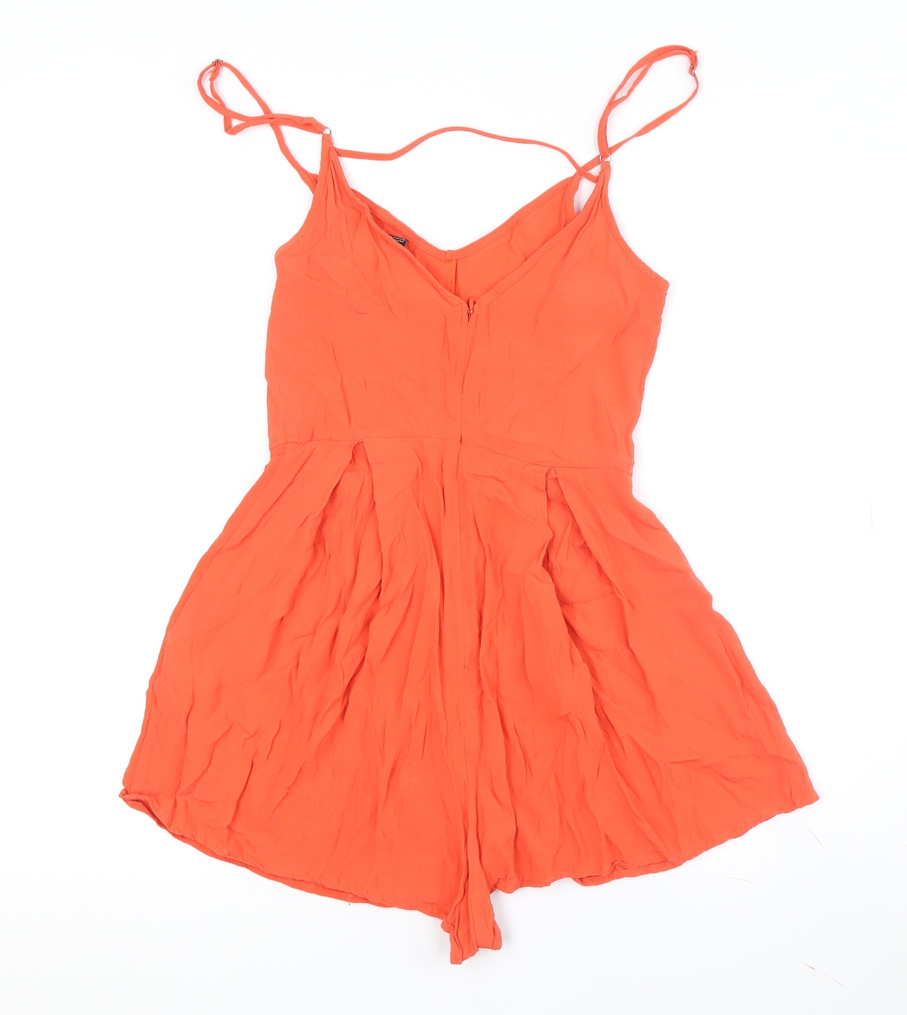 Embrace chic comfort with this MINKPINK Women's Orange XS Playsuit. Designed with a vibrant orange hue, it features a stylish V-neckline, making it perfect for sunny days and casual outings. Crafted from lightweight viscose, this playsuit offers a breathable fit, ensuring you stay cool and comfortable. The sleeveless design enhances airflow, while the secure zip closure allows for easy wear. Ideal for summer occasions, pair it with sandals or sneakers for a relaxed look. Despite showing normal creasing, it remains in excellent condition, making it a great addition to any wardrobe. Hand wash only to maintain quality.
