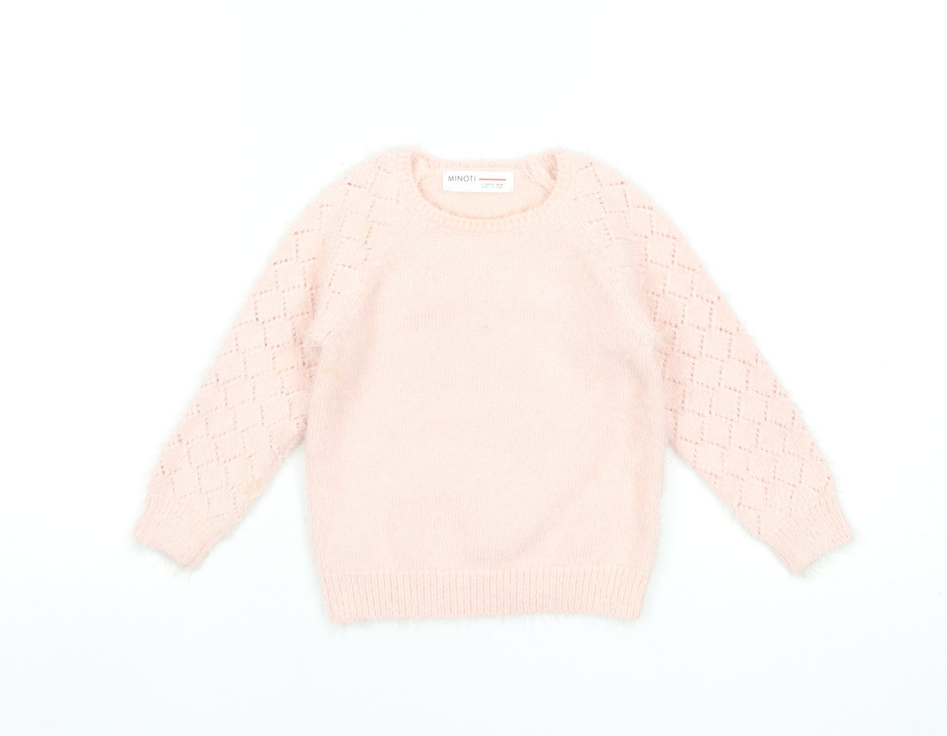 Add a charming and cosy touch to your child's wardrobe with this lovely Minoti girls’ pink pullover jumper. Designed for girls aged 3 years, the jumper combines style and comfort perfectly. The soft knit construction, made from a blend of nylon and acrylic, offers a cosy feel and gentle stretch, making it perfect for keeping your little one warm in cooler seasons. The jumper showcases a delicate blush pink hue, which lends a sweet and versatile look suitable for both casual outings and family gatherings. Diamond-patterned sleeves add a subtle textured detail, providing a touch of design flair while keeping the overall look timeless and adorable. The classic crew neck design and long sleeves ensure comfort and practicality throughout the day. Its lightweight yet insulating texture makes it ideal for layering during autumn and winter. Whether paired with jeans, leggings or a cute skirt, this Minoti jumper blends everyday wearability with an elegant charm. Perfect for active days, parties, or casual events, its simple pullover style makes dressing easy and fuss-free. Designed by the reputable brand Minoti, you can expect durability and softness that withstands regular use while maintaining its shape and feel. This jumper is in excellent pre-loved condition, inspected carefully to ensure quality and comfort. A must-have addition to any little girl’s collection, this piece promises warmth, softness, and sweetness in every wear.