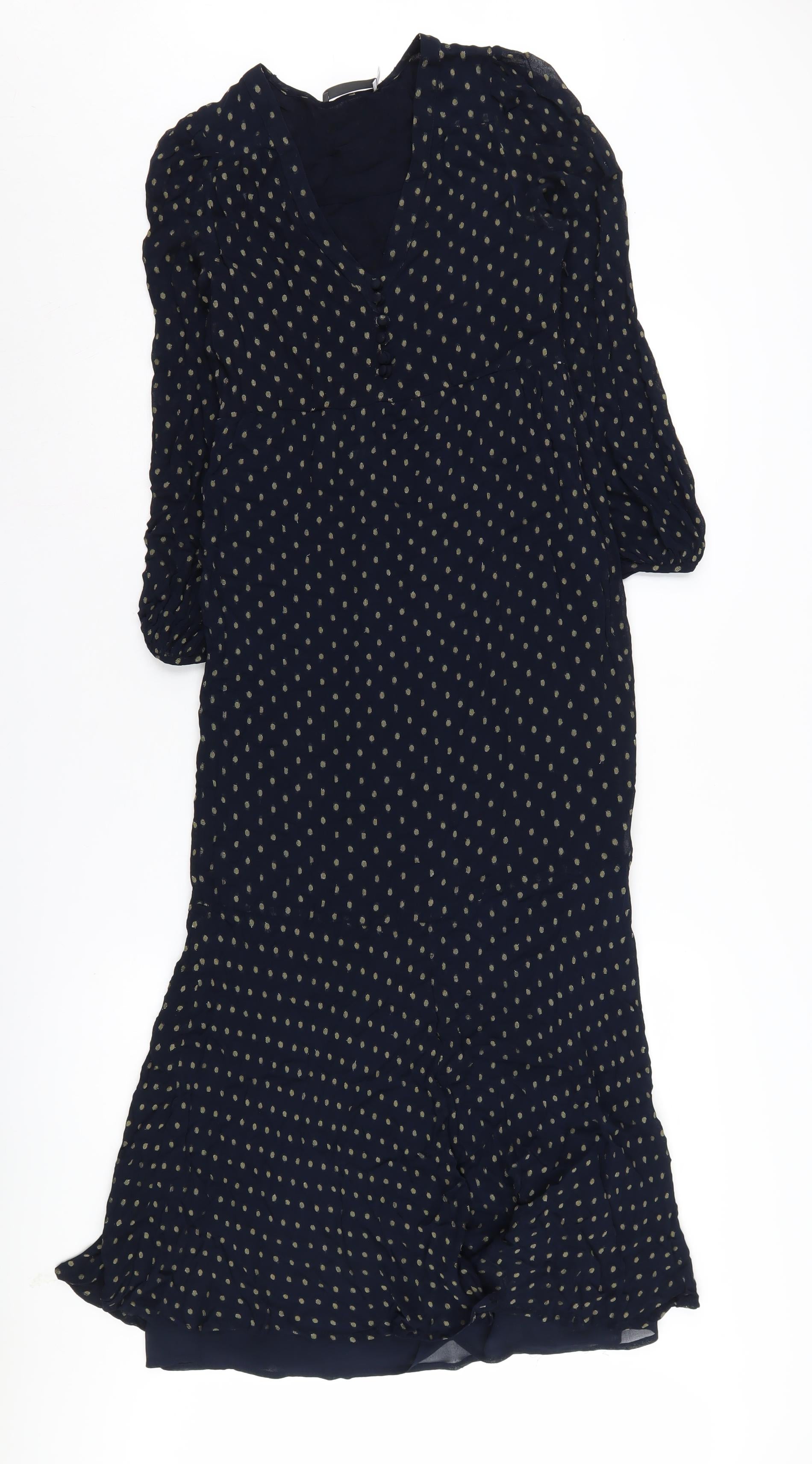 This Mint Velvet dress is a perfect addition to any wardrobe, offering a blend of style and comfort. Crafted from high-quality woven viscose with a dash of metallic fibre and polyester, it features a charming polka dot pattern that captures attention effortlessly. The dress is designed in a flattering fit & flare style, ideal for enhancing the feminine silhouette. It includes 3/4 balloon sleeves and a V-neckline, promoting a stylish yet breathable wear. Fitted with a button closure, this dress ensures ease of use while maintaining elegance.Hit the scene at your next gathering with this versatile dress suitable for both spring and summer occasions like parties and cocktails. It boasts a delicate, lightweight feel with added lining for enhanced comfort. The beautiful blue hue further accentuates its appeal, making it an excellent choice for daytime outings and evening events alike.Crafted with thoughtful craftsmanship, this dress upholds Mint Velvet’s promise of high-quality design, making it a must-have for those seeking a blend of sophistication and ease. Complement this dress with a stylish clutch and heels to finish your look and make a striking impression anywhere you go.