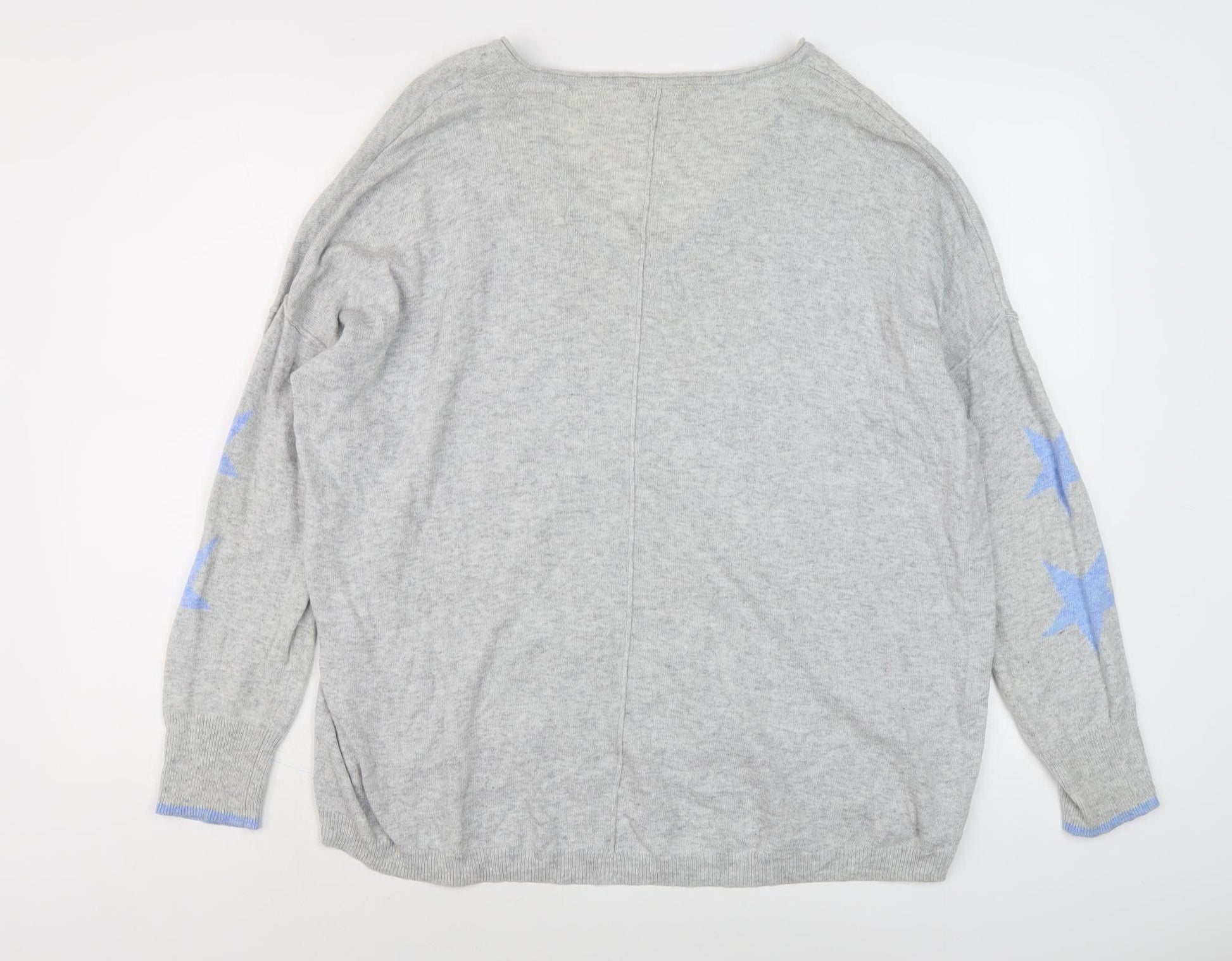 Dive into elegance with this Mint Velvet grey pullover designed specifically for women who adore comfort and style. Crafted with a V-neckline, this jumper seamlessly blends sophistication with a relaxed vibe, making it perfect for casual occasions. The relaxed fit and Dolman sleeves promise a flattering silhouette while providing ultimate comfort and a laid-back feel. Designed in a neutral grey colour, this jumper is versatile enough to pair with various outfits, whether you're heading to brunch or enjoying a quiet day indoors. Its lightweight knit fabric equips you to tackle the cooler months in style, including autumn, winter, and spring. Although gently worn, it remains in excellent condition with only minor wear visible, ensuring you enjoy this elegant piece for seasons to come. The minimal star theme adds a touch of whimsy without overwhelming the chic design. Perfect for casual outings, this Mint Velvet jumper is your go-to piece when aiming for effortless style. Available in size L, it suits regular body types, offering a luxurious fit. Embrace the versatile charm of this jumper and make it a staple in your fashion collection today.