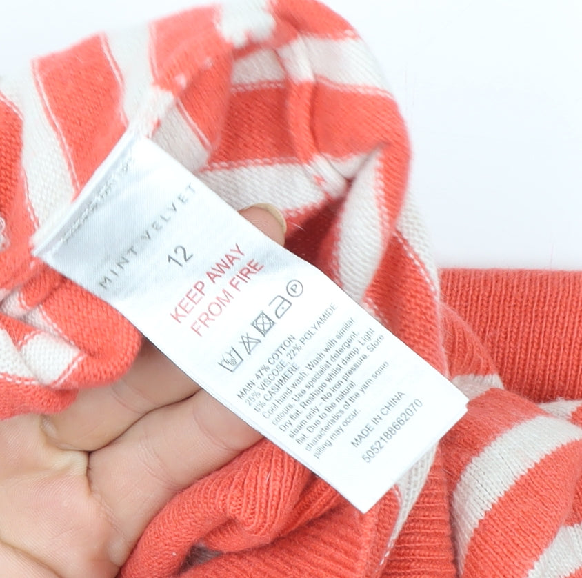 Elevate your everyday style with this charming Mint Velvet women’s striped pullover jumper, crafted in a soft cotton, cashmere and polyamide blend for a lightweight yet cosy feel. The warm coral orange hue and contrasting cream stripes bring a vibrant, casual aesthetic that’s both flattering and comfortable. Distinctive heart-shaped elbow patches add a playful touch of personality, creating an effortlessly stylish piece that transitions seamlessly between casual outings, relaxed weekends, and smart-casual events. Featuring a classic crew neckline and long sleeves, this pullover delivers a timeless silhouette that pairs perfectly with jeans, trousers, or skirts. Designed in a fine knit fabric, the jumper is breathable and ideal for layering across seasons—from cool spring mornings to crisp autumn afternoons. The soft-knit construction ensures lasting comfort, while the luxurious hint of cashmere gives it a smooth, premium finish. Its easy-care material and resilient shape retention make it a practical wardrobe favourite. The relaxed yet feminine fit offers a flattering drape suitable for multiple body types. Mint Velvet’s attention to detail and quality craftsmanship make this striped jumper a must-have wardrobe staple. Perfect for those who love chic, versatile knitwear, this stylish pullover embodies effortless sophistication with a fun contemporary twist. A great choice whether dressing down with denim or dressing up with tailored trousers, it delivers both comfort and charm in equal measure. Size UK 12. Condition is excellent with minimal signs of wear.