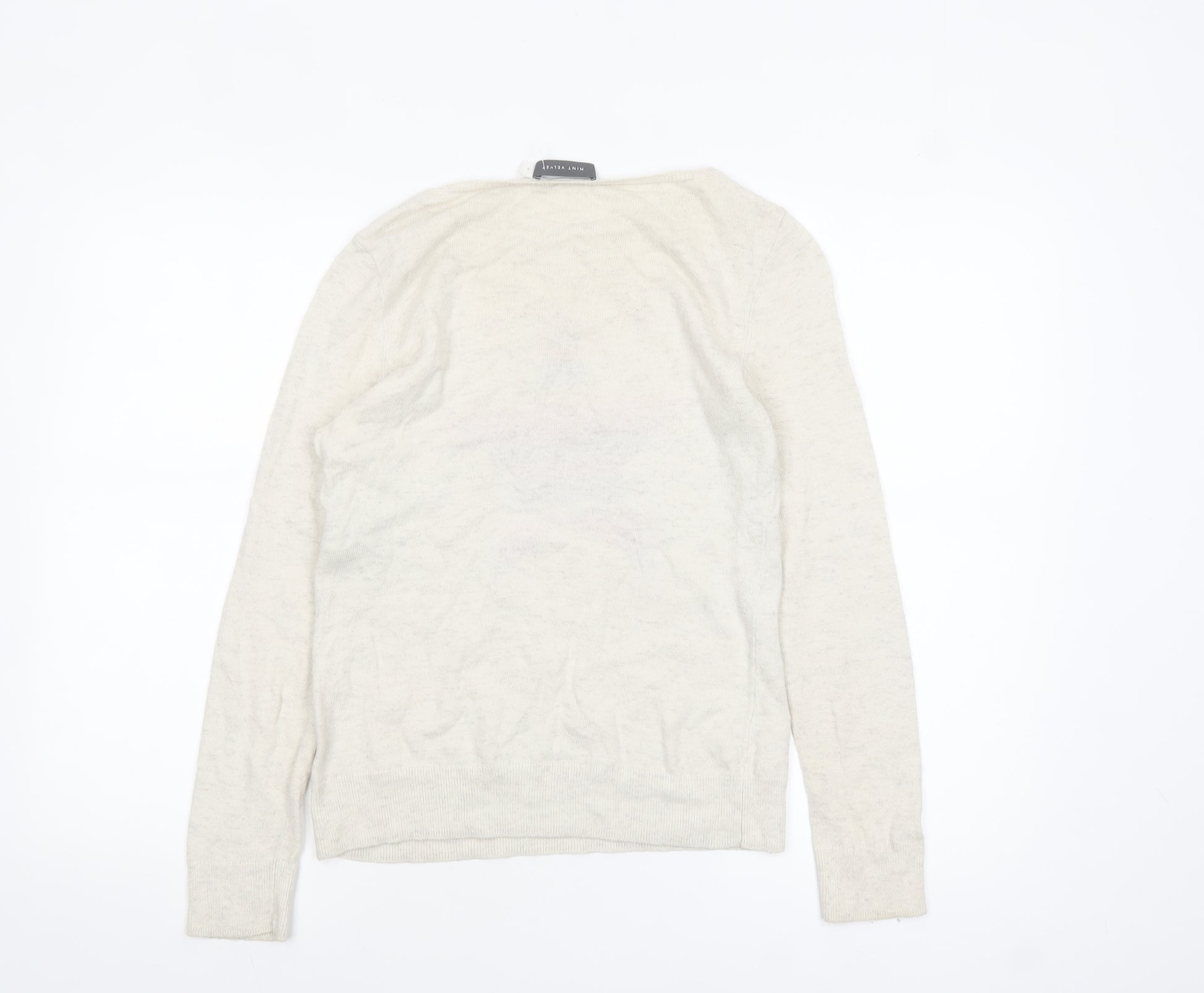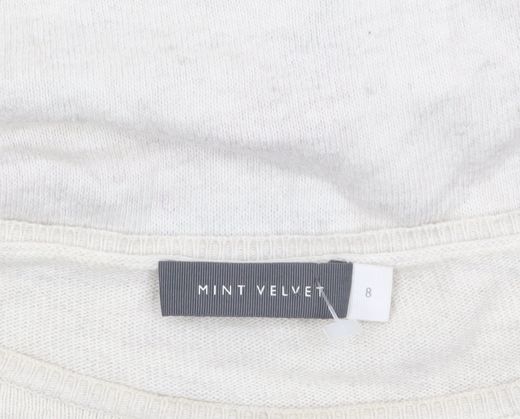 Add a touch of effortless charm to your casual wardrobe with this stunning Mint Velvet Women's Pullover Jumper in size 8. Crafted in a soft ivory knit, the jumper features a bold multicoloured star motif across the chest, bringing a playful yet stylish focal point to the classic design. It perfectly blends everyday comfort with chic appeal, making it ideal for both relaxed weekends and casual outings. Designed with a flattering crew neckline and long sleeves, this jumper offers a timeless silhouette suitable for pairing with jeans, skirts or layered over dresses. The lightweight knit made from a blend of cotton, viscose, polyamide, and cashmere ensures a soft, breathable feel while maintaining shape and durability over time. The subtle cashmere content adds a hint of luxury without compromising comfort, making it beautifully cosy for cooler seasons. With its tight-knit style and contemporary star detail, this Mint Velvet jumper adds a fashionable twist to a wardrobe staple. The neutral ivory colour keeps it versatile enough to coordinate with a wide variety of tones and textures. Ideal for casual everyday wear, travel, or laid-back meet-ups, it transitions easily across autumn, winter, and spring seasons. This jumper remains in excellent pre-owned condition, showing only light natural wear. With its soft handle and comfortable regular fit, it’s a perfect choice for anyone seeking a stylish yet practical addition to their knitwear collection. Embrace effortless elegance and bring a pop of colour to your look — this Mint Velvet piece captures both quality and understated sophistication at once. Pair it with skinny jeans and ankle boots for a relaxed day look or layer over a collared shirt for a chic smart-casual style. An ideal jumper for those who love combining comfort, quality, and personality in one timeless garment.
