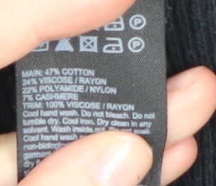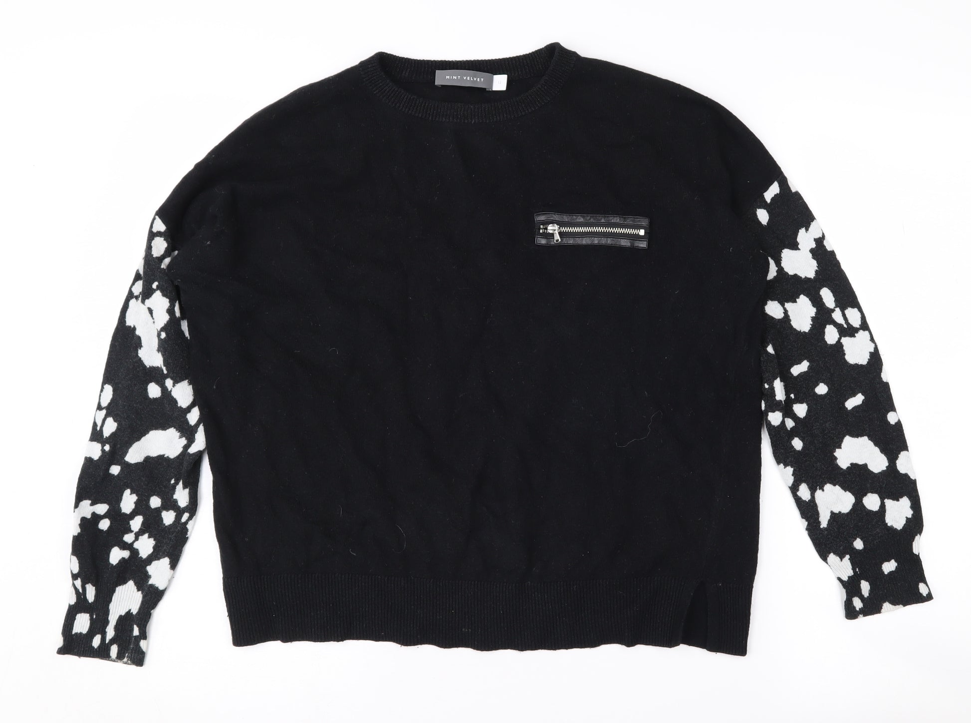 Elevate your casual wardrobe with this stunning Mint Velvet pullover jumper. Crafted for women seeking both style and comfort, this black jumper features a striking animal print design on the sleeves, adding a trendy touch to your outfit. Made from a luxurious blend of cotton, viscose, nylon, and cashmere, this knit fabric offers softness and warmth, perfect for all seasons. The crew neck design and long sleeves provide a classic silhouette, while the stylish zip accent adds a modern twist. Versatile yet chic, this jumper is ideal for casual occasions and can be effortlessly paired with your favourite jeans or skirts. In excellent condition with no visible wear, it's a perfect addition to your collection. Hand wash only to maintain its quality and ensure longevity.