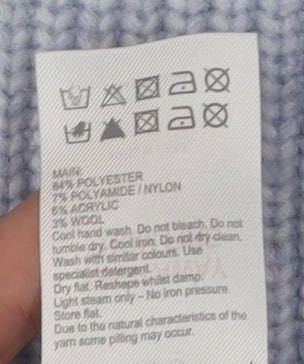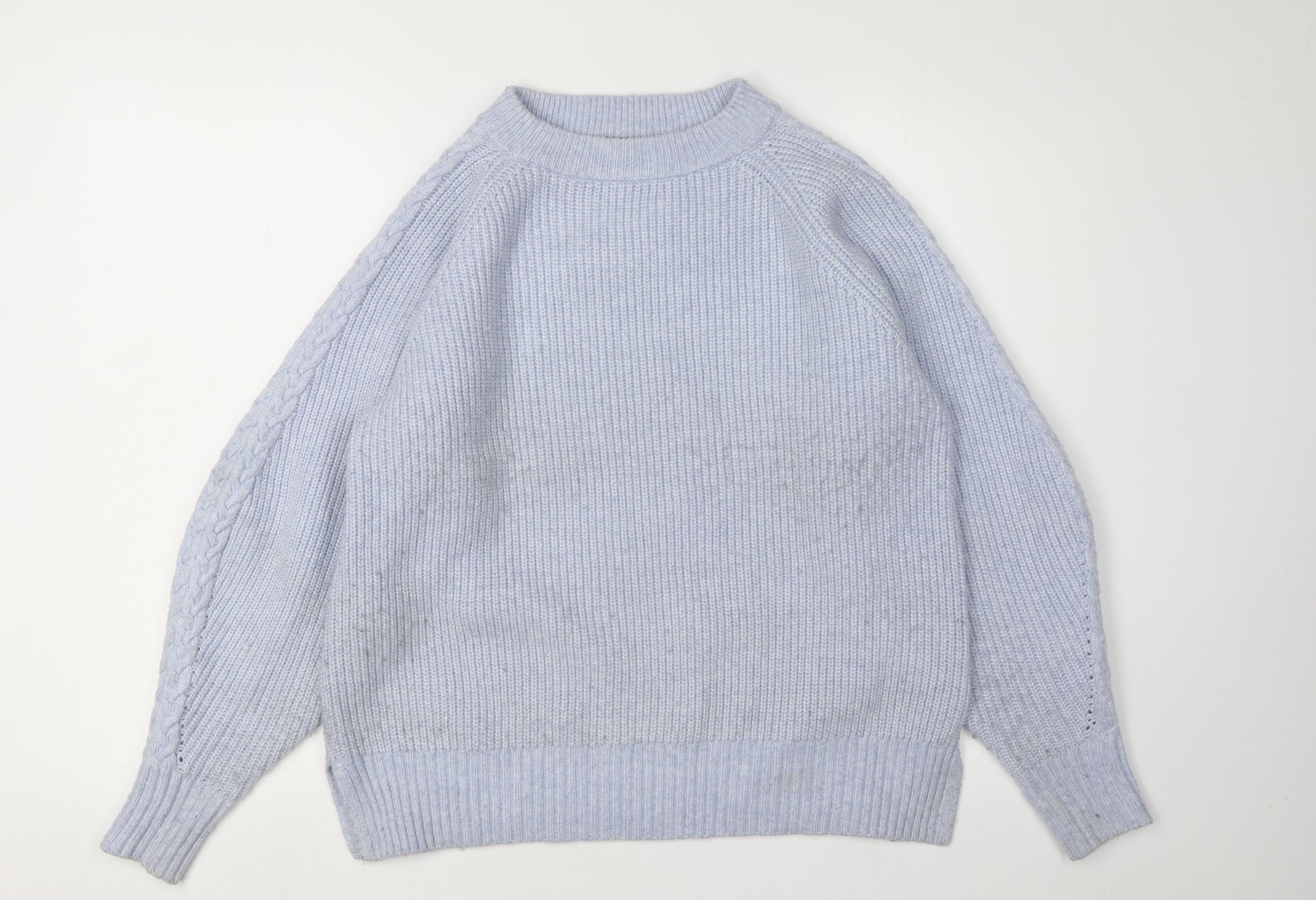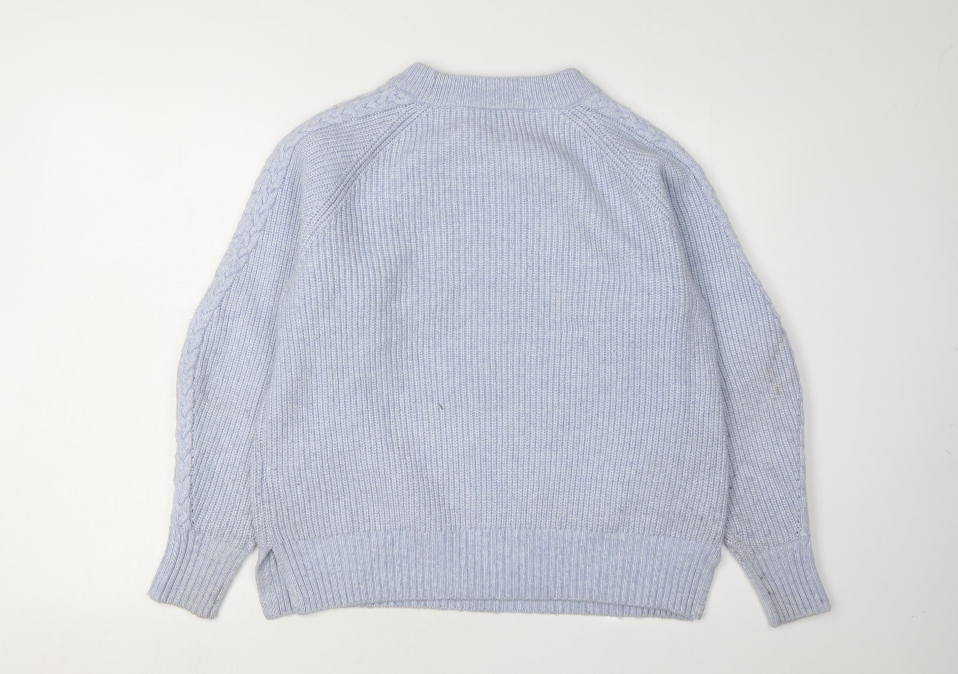 Elevate your seasonal wardrobe with this luxurious Mint Velvet women's jumper in a soothing blue hue. Crafted from a rich blend of polyester, polyamide, acrylic, and wool, this pullover offers a soft-to-the-touch feel while ensuring comfort and warmth during the cooler months. Designed with a classic crew neck and long raglan sleeves, it provides a timeless silhouette that flatters every figure.The intricate cable-knit style along the sleeves adds a touch of sophistication, making this jumper a versatile addition to your casual wardrobe. Its regular fit accommodates easy layering over your favourite tops or shirts, perfect for those leisurely days or relaxed gatherings.Although it is in excellent condition, please note the slight discoloration on the hem, which doesn't compromise the overall appeal of the garment. Pair it effortlessly with jeans or leggings for a casual, yet chic look. Suitable for both autumn and winter, this blue knit is a must-have for any style-conscious individual.With its unique blend of materials, this jumper promises durability and a comfortable wear. Keep it looking its best by adhering to the hand wash care instructions. Whether you're heading out for a casual meet-up or enjoying a cosy afternoon indoors, this Mint Velvet jumper will keep you stylishly snug.
