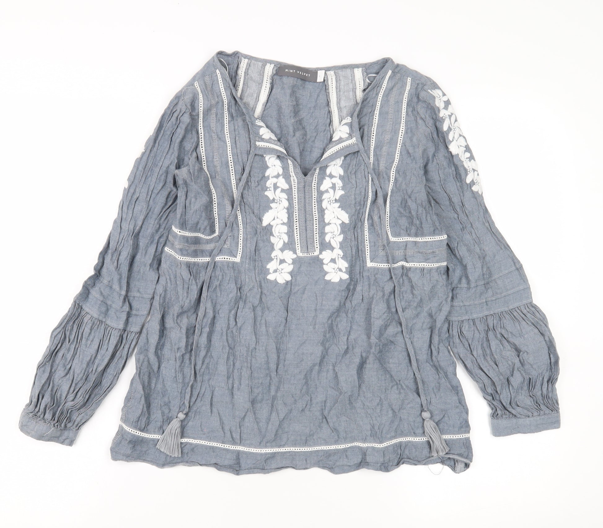 Discover contemporary elegance with this Mint Velvet Women's Blue Tunic Top, designed in a charming size 6 fit. Exuding a relaxed yet sophisticated vibe, this tunic showcases exquisite embroidered accents that add a touch of intricate detail to its overall design. Crafted for casual occasions, it makes for a versatile addition to your wardrobe. Featuring long balloon sleeves, the tunic effortlessly blends modern aesthetics with classic charm. The solid blue colour provides a serene backdrop, perfect for pairing with a variety of outfits. Crafted mainly from high-quality cotton, this tunic promises comfort and durability, making it an ideal choice for day-to-day wear. The absence of original sales tags indicates that this item is in excellent condition, without any visible flaws. Style it casually for a daytime outing or dress it up for a relaxed evening with friends. Whether you're heading to a casual get-together or simply going about your day, this Mint Velvet Tunic adds a hint of contemporary elegance to your ensemble. Elevate your style with this delightful piece that marries comfort with a refined aesthetic.