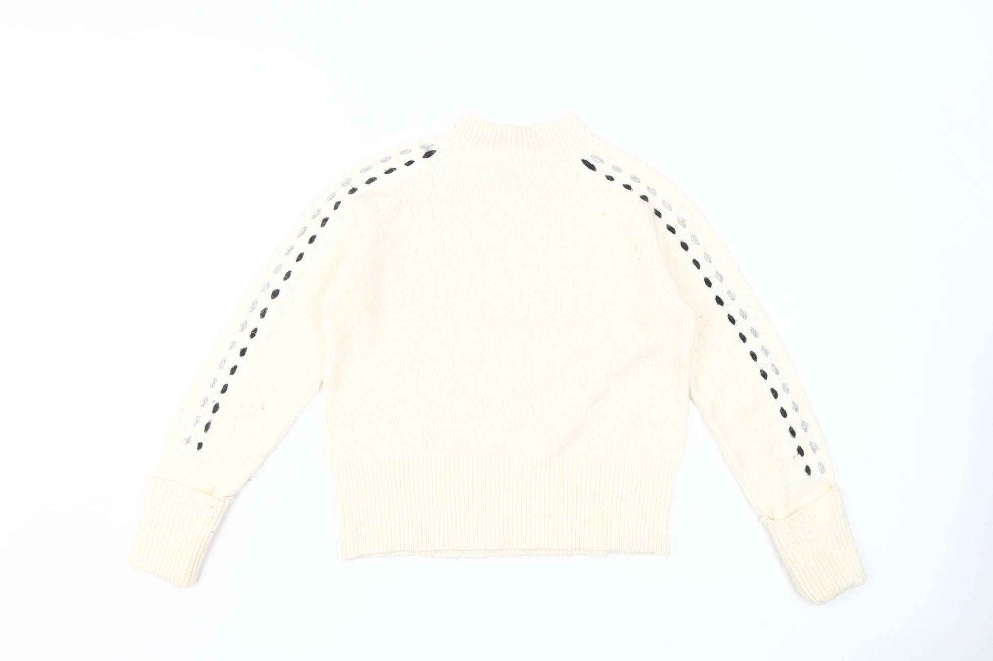 Elevate your winter wardrobe with this exquisite Mint Velvet Women's Ivory Pullover Jumper. Fashioned in a figure-flattering size 8, this elegant high-neck piece combines modern style with everyday comfort. Rendered in a sophisticated ivory hue, this regular fit jumper is perfect for casual occasions, making it a versatile addition to your autumn and winter outfits. The garment is crafted using a durable blend of acrylic, nylon, and wool, delivering warmth and style in equal measure, with a soft knit finish that is gentle against your skin. Featuring long raglan sleeves for a relaxed silhouette, this pullover boasts a high neck which adds a touch of elegance to its design, ideal for layering with your favourite coats and scarves during cooler months. Whether heading to a laid-back gathering or enjoying a cosy day at home, this Mint Velvet pullover jumper offers unparalleled style and comfort. With its simple and chic pattern, this jumper is a timeless piece guaranteed to keep you warm and stylish all season long. Hand wash only to maintain its pristine condition. Don't miss out on this wardrobe essential – buy now to elevate your everyday fashion.