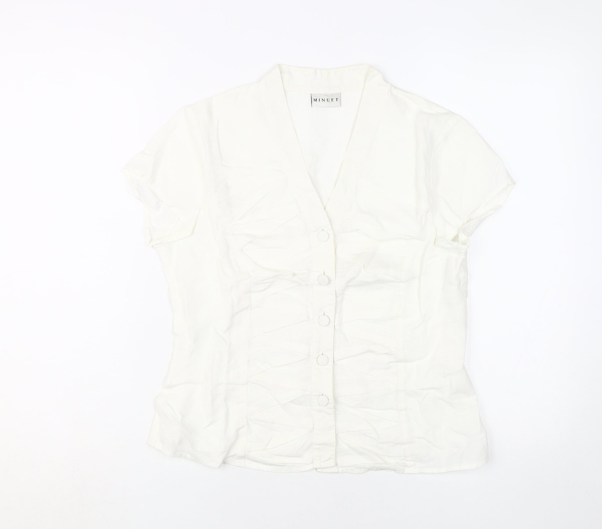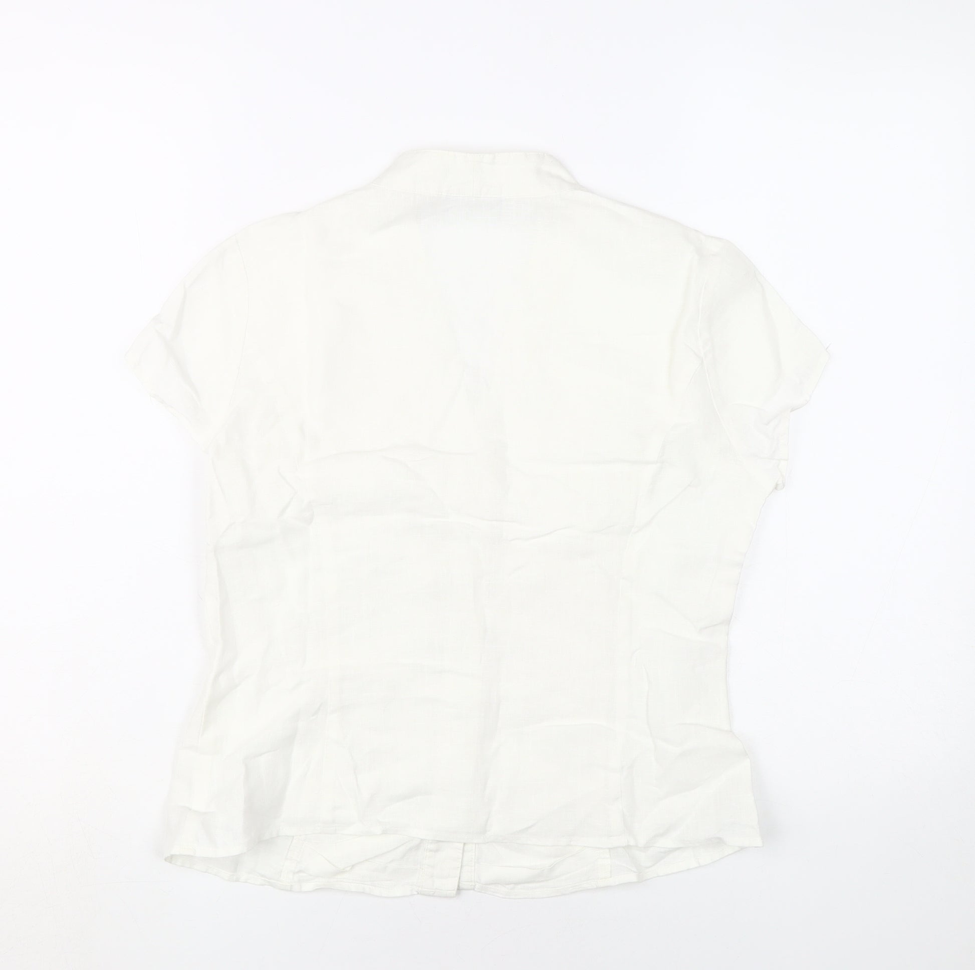 Upgrade your wardrobe with this classic and versatile Minuet Women's White Linen Blouse. Crafted from 100% high-quality linen, this blouse offers a relaxed yet refined look, perfect for everyday wear. Designed for comfort and style, it features a flattering V-neckline and short sleeves, making it ideal for casual outings or dressed-up occasions alike. The button accents add a touch of elegance, while the classic fit ensures you stay comfortable throughout the day. Available in a versatile solid white, this blouse can easily be paired with different outfits, offering endless styling possibilities. Whether paired with jeans for a laid-back look or a skirt for a more polished appearance, this blouse is a must-have for any fashion-forward wardrobe. Don't miss out on this opportunity to add a chic and functional piece to your collection.
