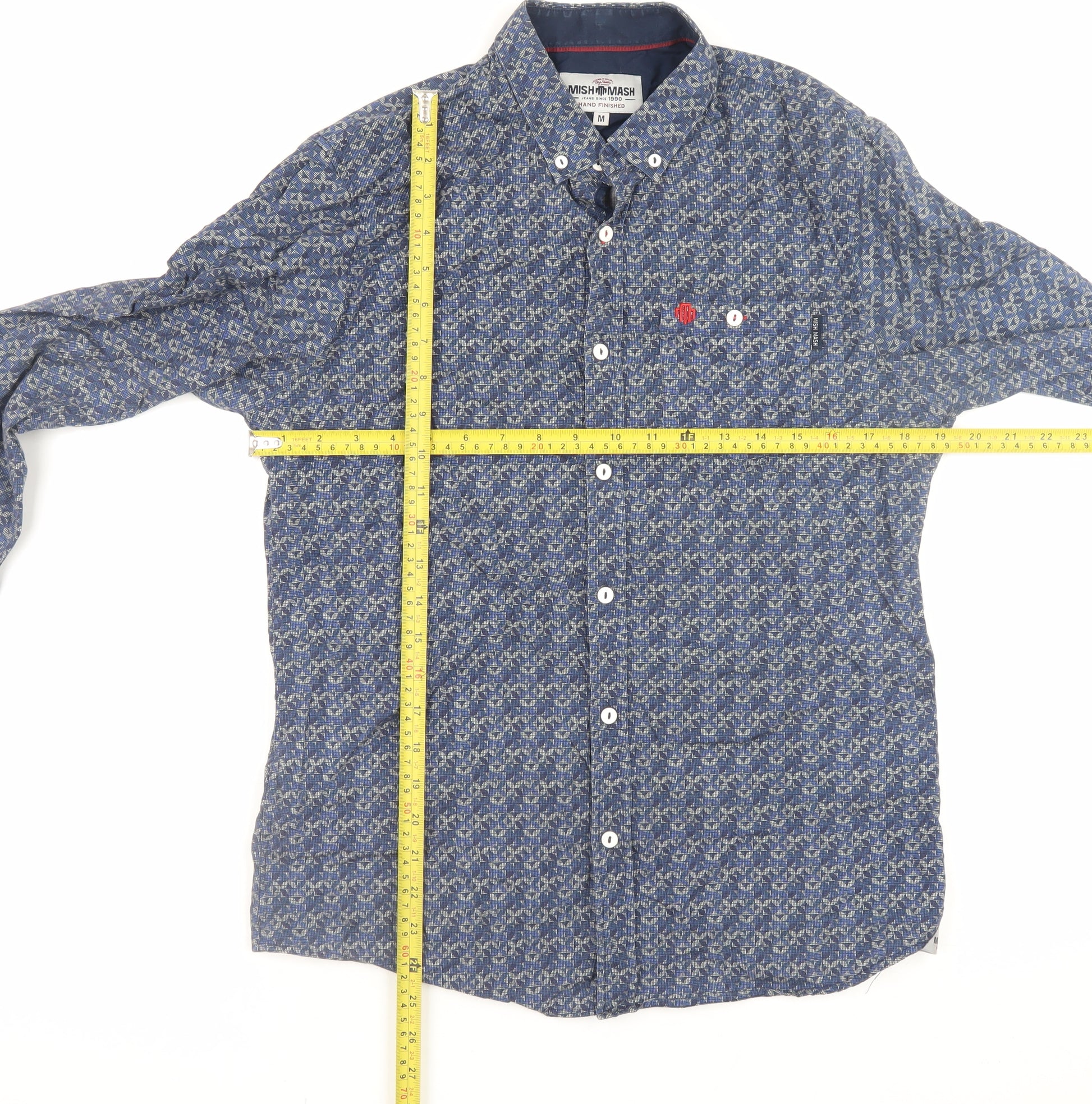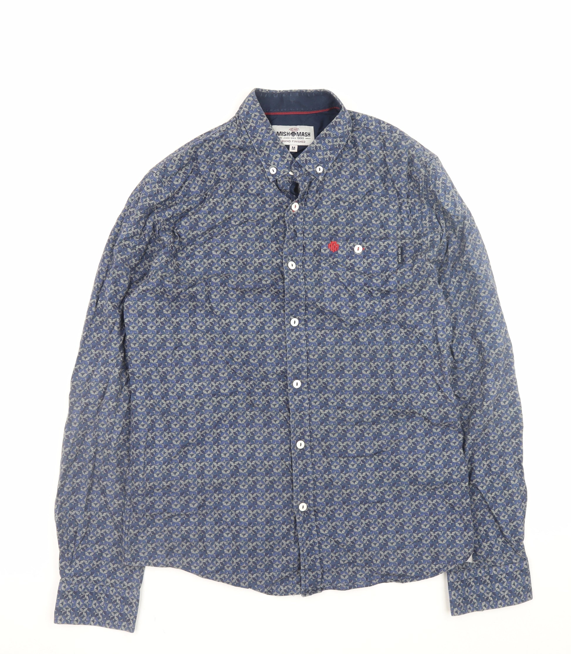 Upgrade your casual wardrobe with this striking Mish Mash men's long sleeve shirt, crafted in a smart blue hue with an intricate geometric pattern throughout. Designed for the modern man, this medium-sized shirt features a regular fit that offers comfort without compromising style. The button-down collar gives it a polished yet relaxed appeal, perfectly suited for both casual Fridays at work and weekend outings. Made from 100% cotton, the fabric is woven for a soft, breathable feel against the skin, ensuring you stay comfortable throughout the day. The shirt’s button fastening front and cuffs add a traditional touch, while the subtle red embroidered logo detail at the chest elevates the overall design. Lightweight and easy to care for, it's versatile enough to pair effortlessly with jeans or chinos for a laid-back yet stylish look. Whether layered under a jacket or worn solo, this shirt captures the perfect balance of everyday practicality and refined flair. The quality craftsmanship and attention to detail highlight Mish Mash’s dedication to contemporary British menswear. With its timeless design and durable cotton fabric, this piece is built to last season after season, making it an ideal addition to any man’s wardrobe. A stylish staple for spring, summer or autumn, this geometric blue cotton shirt is a dependable choice for casual, smart-casual, or travel occasions, offering effortless wearability. Add it to your collection today for understated sophistication and everyday comfort.