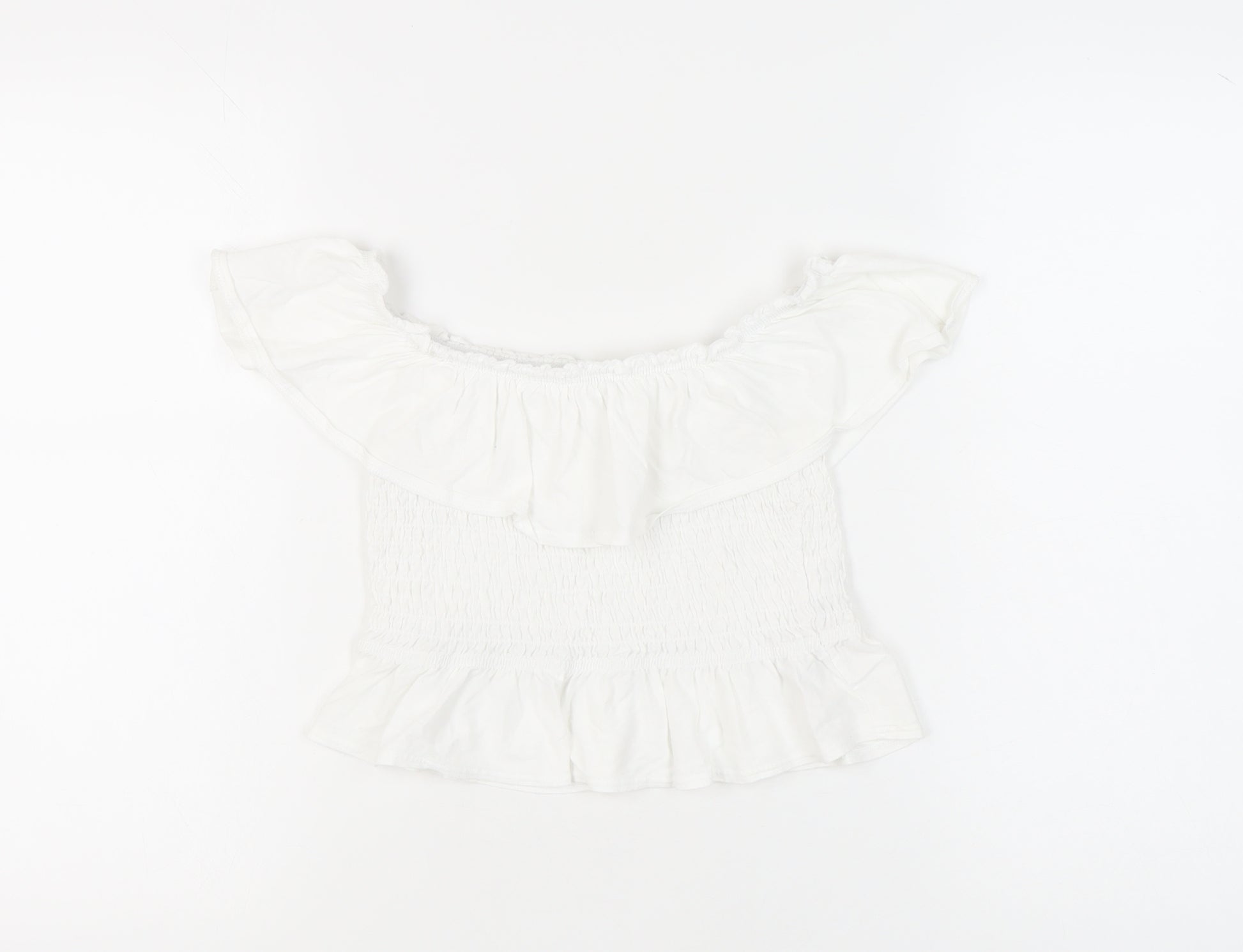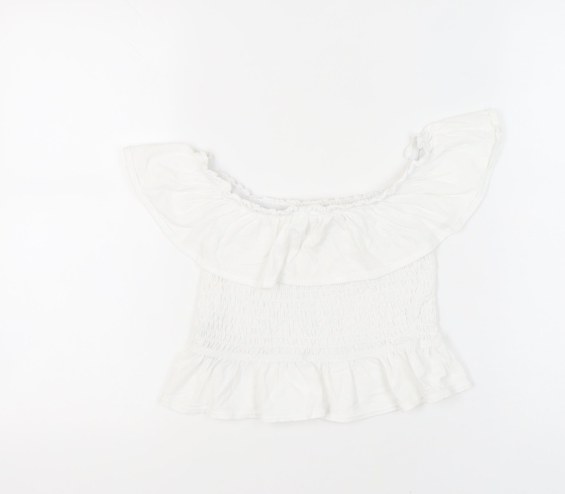 Step into the sunny seasons with confidence in this Miss Selfridge white off the shoulder top. Perfect for casual summer outings, this white solid blouse exudes elegance and simplicity. Crafted from comfortable cotton, it ensures a cool and breathable feel. Featuring delightful ruffle accents on the neckline, this top boasts a charming feminine touch. Ideal for everyday wear, the off the shoulder style adds a dash of chic allure, making it a must-have for your warm-weather wardrobe. With its regular size fit and simple pullover closure, it offers ease and style in one go. Although it's in excellent condition with no visible flaws, original sales tags are not present. Pair it with jeans or a skirt for a casual day out, or accessorize for a more polished look. An essential addition to any fashion-forward wardrobe, this top promises both style and comfort.