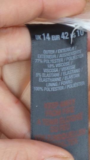 Elevate your wardrobe with this elegant Miss Selfridge women’s blazer, designed to add sophistication to your smart and formal ensembles. Crafted from a high-quality blend of polyester, viscose, and elastane, this beige tailored jacket ensures a comfortable yet structured fit. Featuring a smooth, fully lined interior and a refined single-button closure, it provides a polished, figure-flattering silhouette ideal for work, business meetings, and evening events alike. The subtle peplum design at the hem adds a feminine flourish, making this piece suitable for both professional and dressy occasions. The long sleeves and tailored seams enhance the sharp yet soft look, creating an effortlessly chic presence. The woven fabric and stretch component offer ease of movement while maintaining its form throughout the day. With its neutral beige tone, this blazer complements a wide range of wardrobe staples—from classic trousers and pencil skirts to tailored dresses. Perfect for the Autumn, Spring, or Winter seasons, this versatile piece transitions seamlessly between businesswear and stylish casual outfits. Designed with attention to modern tailoring, it exudes timeless appeal with a contemporary edge. Miss Selfridge is known for quality craftsmanship and feminine detail, making this blazer a dependable yet fashion-forward choice. While pre-loved, it remains in excellent condition with only minimal signs of wear and no visible damage, ready to be worn and admired. Ideal for those seeking a professional yet graceful charm, this Miss Selfridge blazer adds confidence and sophistication to any look. Style it with a crisp blouse, heels, and statement accessories for a complete ensemble that's both commanding and elegant—perfect for your workday and beyond.