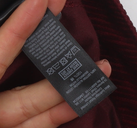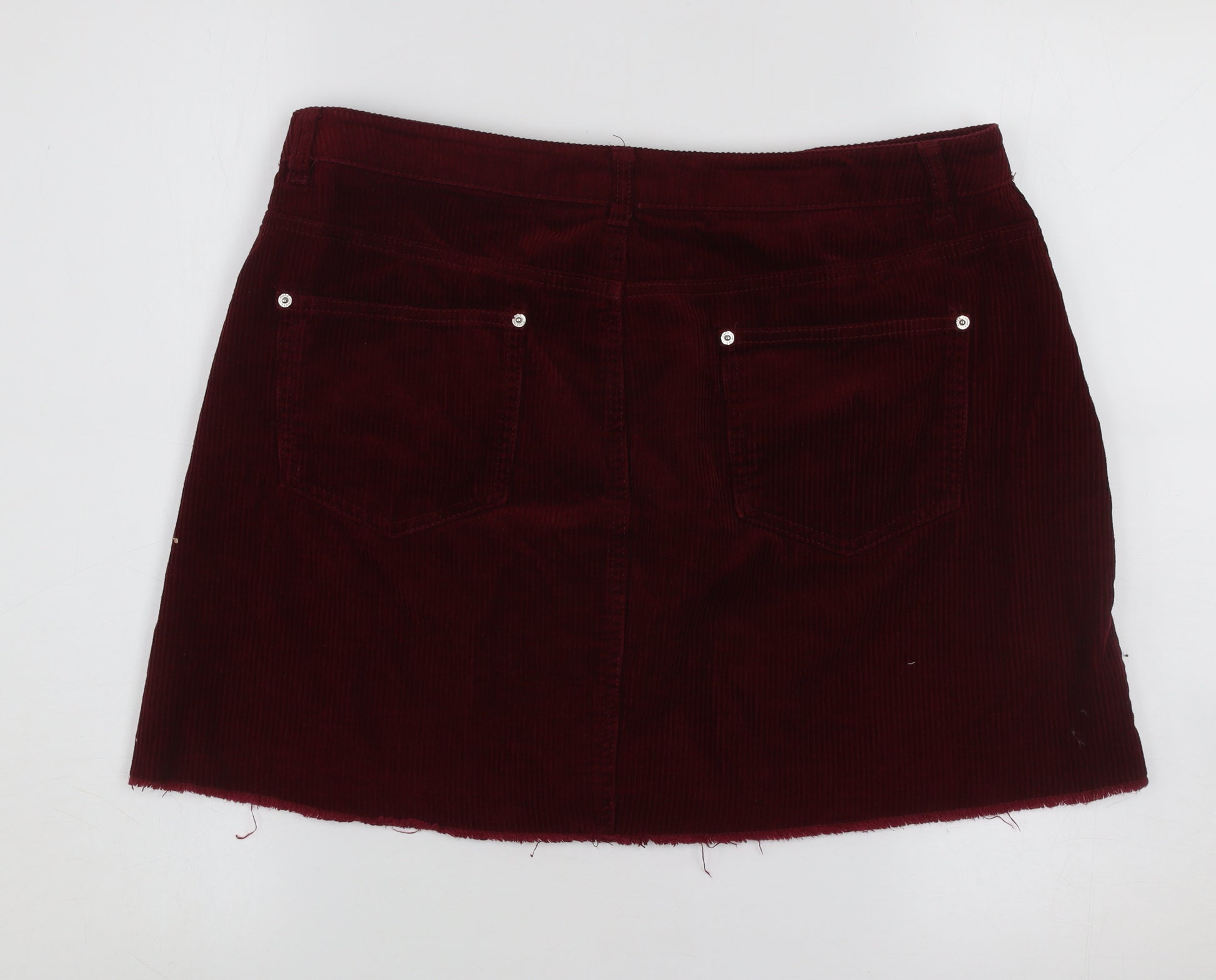Step into timeless casual chic with this classic Miss Selfridge women’s red corduroy skirt in UK size 14. Crafted entirely from soft yet durable 100% cotton, this skirt offers both comfort and structure. The tactile corduroy fabric brings a touch of vintage-inspired texture, while the rich red tone adds depth and warmth—ideal for pairing with cosy jumpers in cooler months or relaxed tops for transitional weather. Designed in a flattering short length, it sits beautifully around mid-rise, providing an easy, comfortable fit that complements the feminine shape without compromising on everyday wearability.Featuring a straight fit that gently follows the body’s natural lines, this skirt captures effortless modern style. Classic five-pocket styling and silver-tone rivet detailing give it a nod to denim influences, while the front zip and button fastening ensure a secure and stylish finish. A slightly raw hem edge gives a subtle laid-back feel, making this piece perfect for casual weekend looks. Team it with ankle boots and a tucked-in blouse for a polished day-out ensemble or sneakers and a tee for an off-duty aesthetic.This Miss Selfridge short corduroy skirt effortlessly transitions from day to night wear and is an excellent choice for autumn and winter layering. Its machine washable care instructions make it convenient for regular use, combining practicality with easy style. In very good pre-loved condition with only minimal signs of wear at the hem, this skirt retains plenty of life and character.A versatile wardrobe staple for those who appreciate both comfort and understated style, this piece embodies Miss Selfridge’s knack for creating contemporary yet classic clothing. Own this beautiful deep red corduroy skirt and enjoy a blend of tactile luxury, modern charm, and everyday functionality—all at an affordable price.