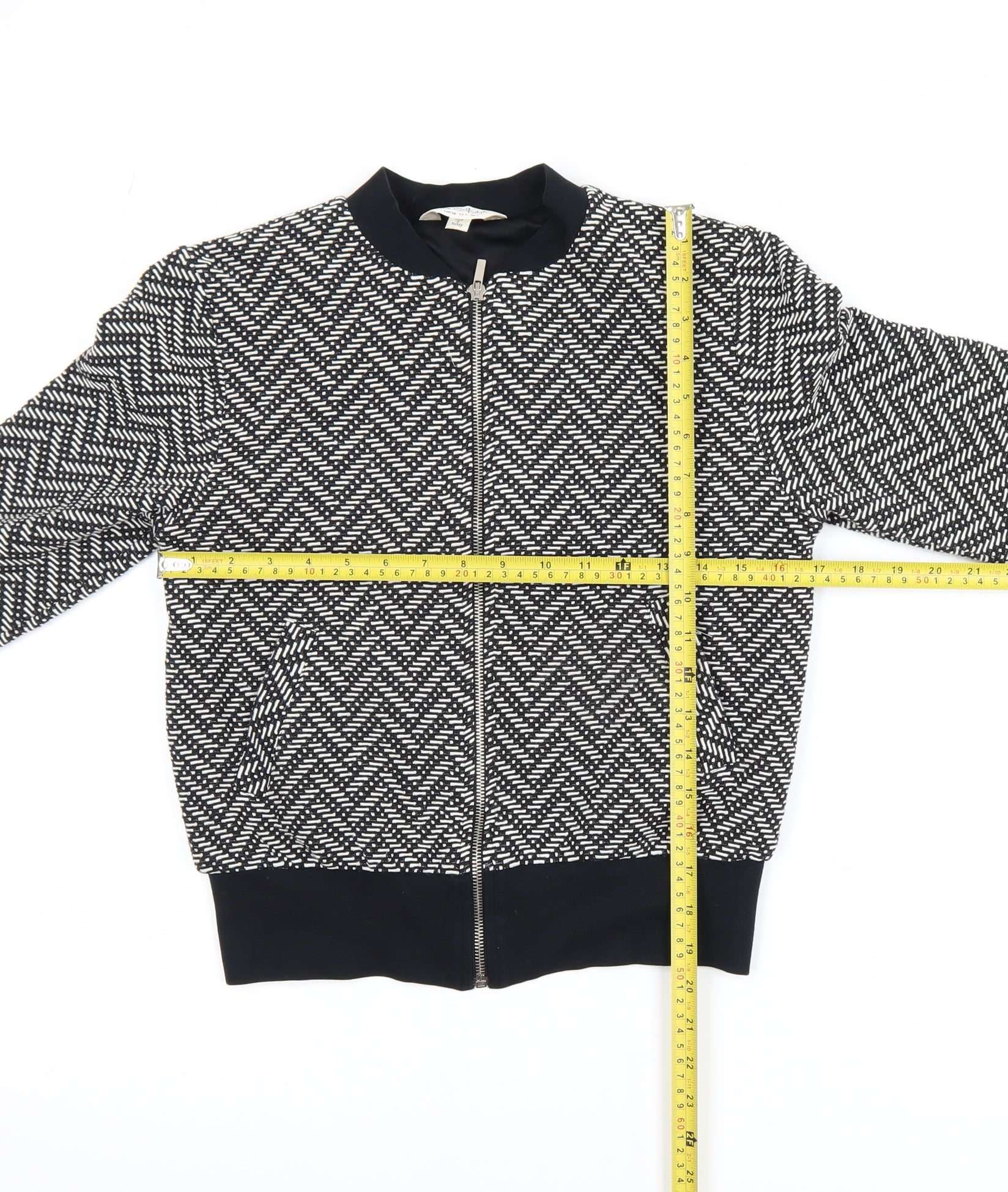Upgrade your casual wardrobe with this stylish Miss Selfridge women’s bomber jacket in a timeless black herringbone pattern. Crafted from a comfortable and durable blend of polyester, cotton, and abaca, this jacket offers both texture and a touch of sophistication. The full zip front and ribbed cuffs create a flattering fit, while the lightweight yet lined construction makes it perfect for layering during the spring and autumn seasons. Designed in a cropped, short length, this bomber jacket complements high-waisted jeans, skirts, or tailored trousers for a polished but relaxed look. The fully lined interior provides added comfort, and side pockets add practicality for everyday wear. The pattern gives a subtle twist to a classic bomber silhouette, ensuring it works well for casual, workwear, or travel settings. The jacket remains in excellent condition, showing little to no signs of previous wear, and retains its original black and white finish with no visible damage or staining. Easy to care for and machine washable, this versatile piece seamlessly combines comfort, style, and ease of maintenance. Originally designed by Miss Selfridge and made in Turkey, this jacket is ideal for women who appreciate feminine tailoring with a modern edge. Its breathable blend of materials provides durability and softness, making it a wardrobe staple that transitions effortlessly from day to evening. Whether worn over a simple T-shirt or paired with a smart blouse, this herringbone bomber adds a chic touch to everyday outfits. A perfect choice for anyone seeking a stylish yet comfortable jacket to elevate their look without compromising practicality. Miss Selfridge’s signature detail ensures that this garment embodies both quality and trend-conscious design – making it a must-have piece for the contemporary woman’s collection.