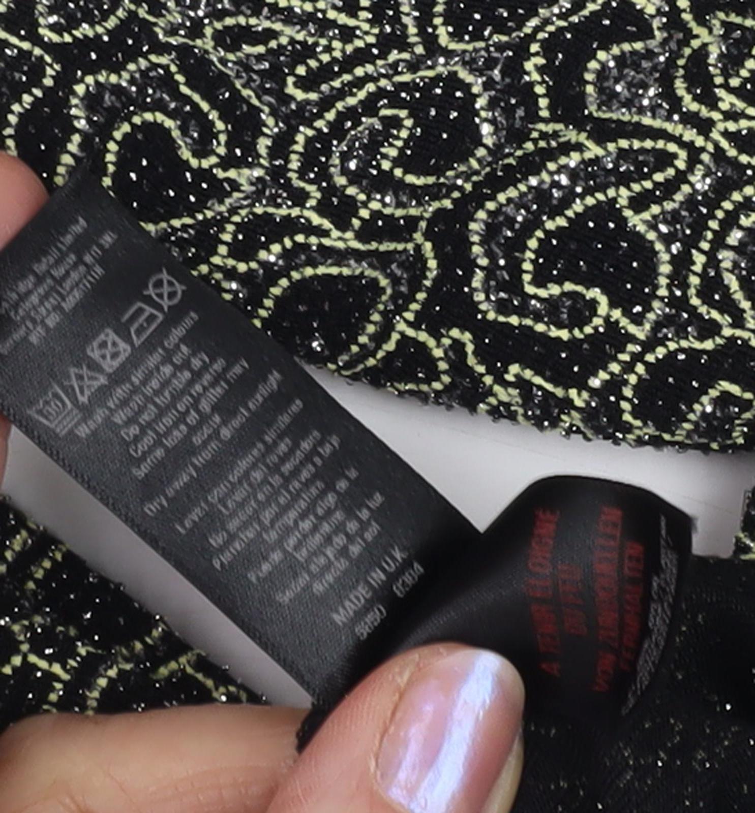 Elevate your wardrobe with this stunning women’s bodycon dress. Designed in a sleek black hue, this dress features intricate geometric lace patterns that add a touch of sophistication. The scoop neckline gracefully complements its long sleeves, making it perfect for evening occasions or stylish day outings. Crafted from a high-quality blend of nylon, elastane, and metallic fibres, it ensures both comfort and glamour with its slight stretch and subtle shimmer. Whether you're attending a cocktail party or a formal gathering, this dress promises to turn heads and make a statement. Pair it with your favourite heels and minimal jewellery for a chic and elegant look. Perfect for the fashion-forward woman, this dress is brand new and ready to be added to your collection.
