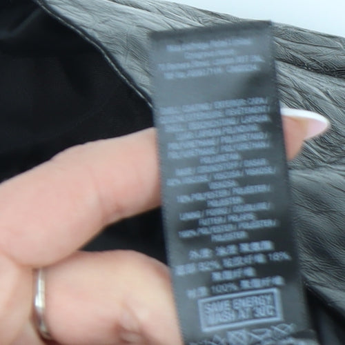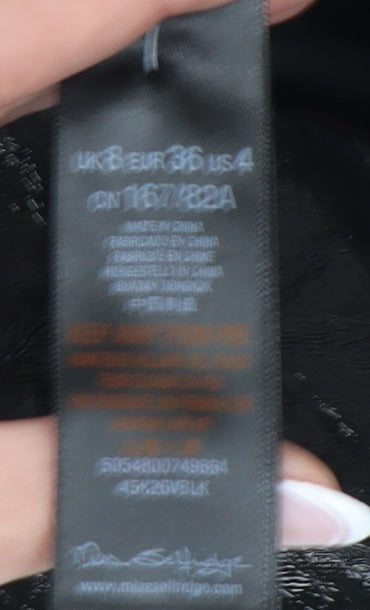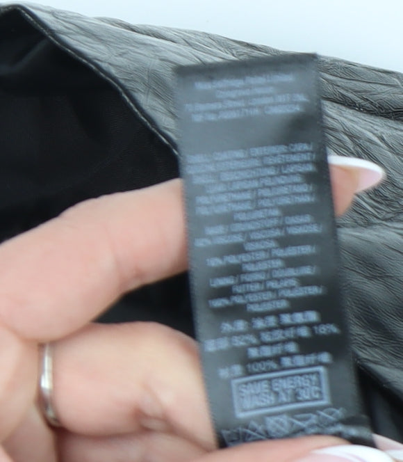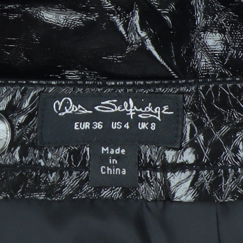 This sleek Miss Selfridge women's pencil skirt in size 8 offers a sophisticated style for any occasion. The classic black colour is both versatile and effortlessly chic, a perfect addition to any wardrobe. Designed for the modern woman, it features a stylish zip accent at the front, enhancing its contemporary look. Made entirely from durable polyester, this skirt ensures longevity and maintains its structure well, mimicking the luxury look of leather. Designed to sit comfortably at a mid-rise on the waist, it flatters every silhouette while offering maximum ease and comfort. Its short length makes it an ideal choice for a night out or a casual day in the city, while the lack of pattern allows it to be effortlessly paired with a variety of tops and accessories. With its straight & pencil style, this skirt seamlessly blends into numerous themes, making it perfect for a casual day's outing or even more formal settings. The garment is machine washable, thus ensuring Quick and convenient care. Despite being pre-owned, it is in excellent condition with no noticeable wear, presenting itself as good as new. Available now at an unbeatable price, this skirt offers exceptional styling as well as comfortable wear, ensuring you step out in style no matter where you're headed.