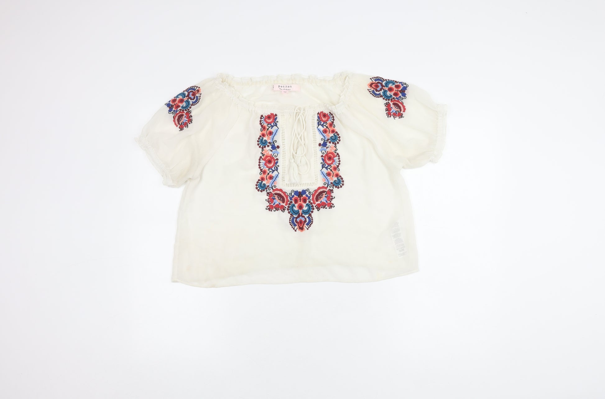 Elevate your wardrobe with this charming Miss Selfridge women's blouse, perfectly embodying a blend of style and comfort. In a crisp white shade, this petite blouse offers a delicate look that's perfect for casual outings or a relaxed day at the office. Embellished with intricate floral embroidery, it adds a touch of femininity and charm to any ensemble.Designed with short sleeves for easy wear and breathability, this blouse is crafted from 100% polyester with lining details made from 100% cotton, ensuring comfort throughout the day. The T-shirt features a versatile design suitable for spring and summer seasons. This beautifully embroidered piece is tailored to fit a UK size 10, ideal for women who prefer stylish, petite-sized tops.The blouse, with its floral pattern and vibrant embroidery, is perfect for adding a splash of colour to your outfit. Casual yet sophisticated, it's great for everyday wear or as part of a chic lunchtime look. Whether you’re pairing it with jeans for a leisurely day out or styling it with a skirt for a smarter approach, this blouse is a versatile addition to any wardrobe.Miss Selfridge brings the essence of contemporary fashion with a touch of glamour, making this blouse a must-have. Enhance your collection with a piece that balances elegance and everyday practicality.