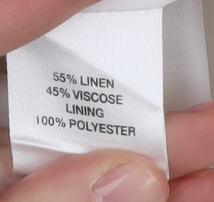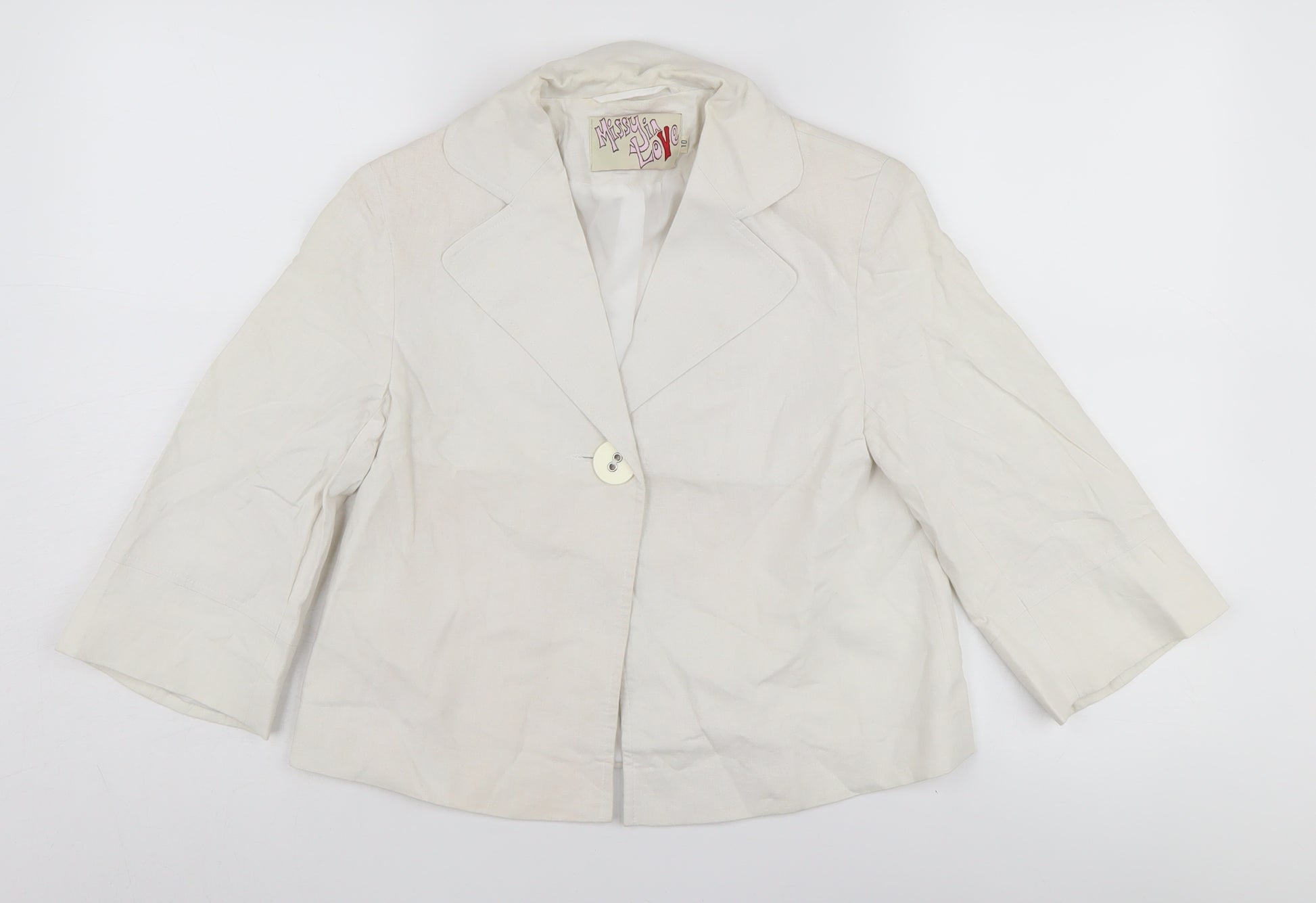 Elevate your wardrobe with this chic Missy In Love women's blazer, perfect for both casual and business occasions. Designed in a pure white tone, this blazer adds a touch of sophistication to any outfit. Crafted from a blend of 55% linen and 45% viscose, it offers a comfortable fit and a natural, breathable quality, ideal for spring and summer seasons. The blazer features a classic notch lapel style and a stylish single-breasted cut, fastened with a single button closure that enhances its tailored appearance. Its 3/4 sleeves lend a modern twist to this timeless piece, making it perfect for layering over your favourite tops. Whether you're dressing up for a day at the office or adding a polished finish to your weekend look, this blazer will never let you down. The polyester lining ensures durability and ease of wear. With no pattern, it remains versatile, easily pairing with printed or solid-coloured attire. Despite being pre-loved, it's in excellent condition, with no visible signs of wear and tear, ensuring you receive a high-quality item. Get ready to make a lasting impression with this wardrobe staple that combines style, comfort, and elegance effortlessly.