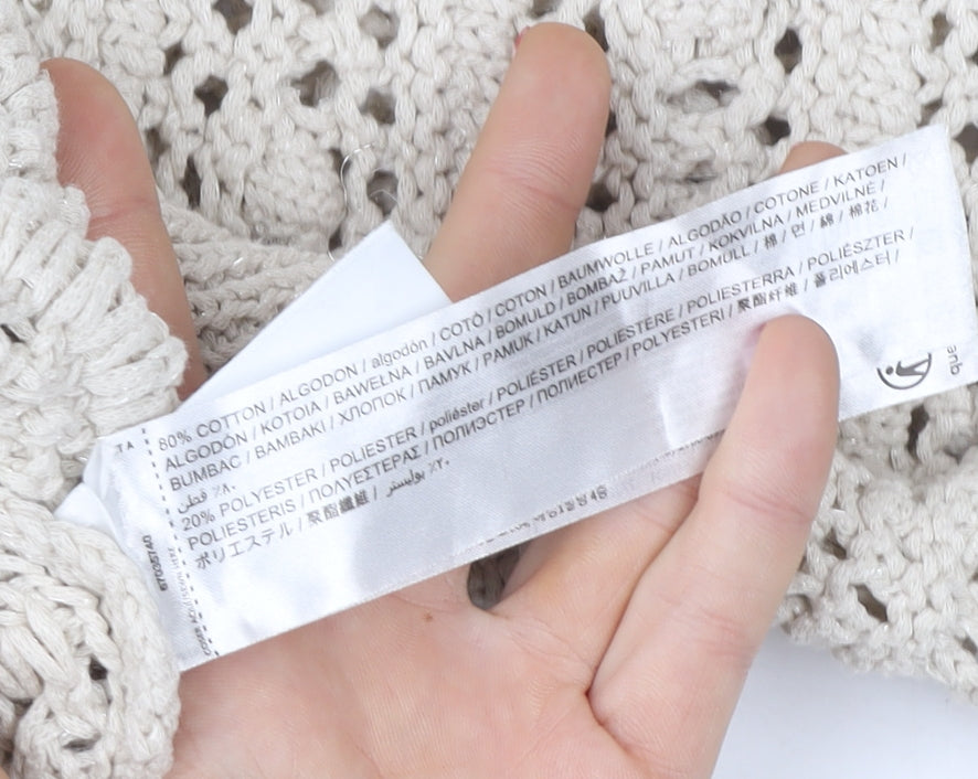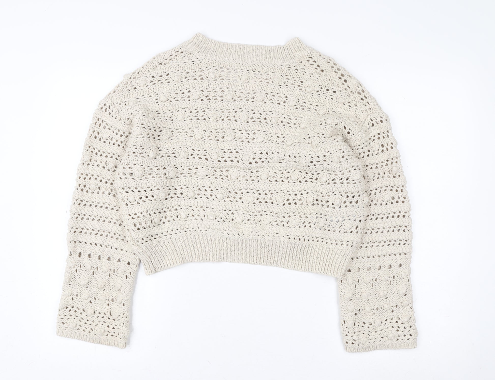 Women Beige Open Knit V-Neck Cotton Jumper Size M
