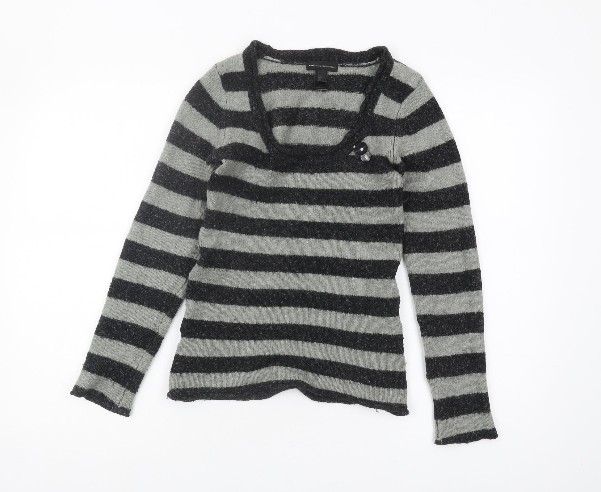 Chic and contemporary, this MNG Casual Sportswear women's jumper is crafted for those who appreciate subtle elegance. Featuring a striking grey striped pattern, this pullover boasts a modern scoop neck and long sleeves, perfect for transitioning through the seasons. The carefully blended mix of acrylic, polyamide, wool, cotton, and elastane ensures a comfortable fit with just the right amount of stretch, aligning with the slim fit design that flatters various body types. Adorned with a stylish button accent at the neck, this piece redefines casual sophistication. The grey tones provide versatile styling options, easily pairing with jeans or skirts for a relaxed yet polished look. Whether you're heading to a casual brunch or a day around town, this jumper is your ideal partner. Offered in an excellent condition, it's perfect for those who enjoy subtle luxury every day. Don't miss this opportunity to add a timeless piece to your wardrobe at an exceptional value.
