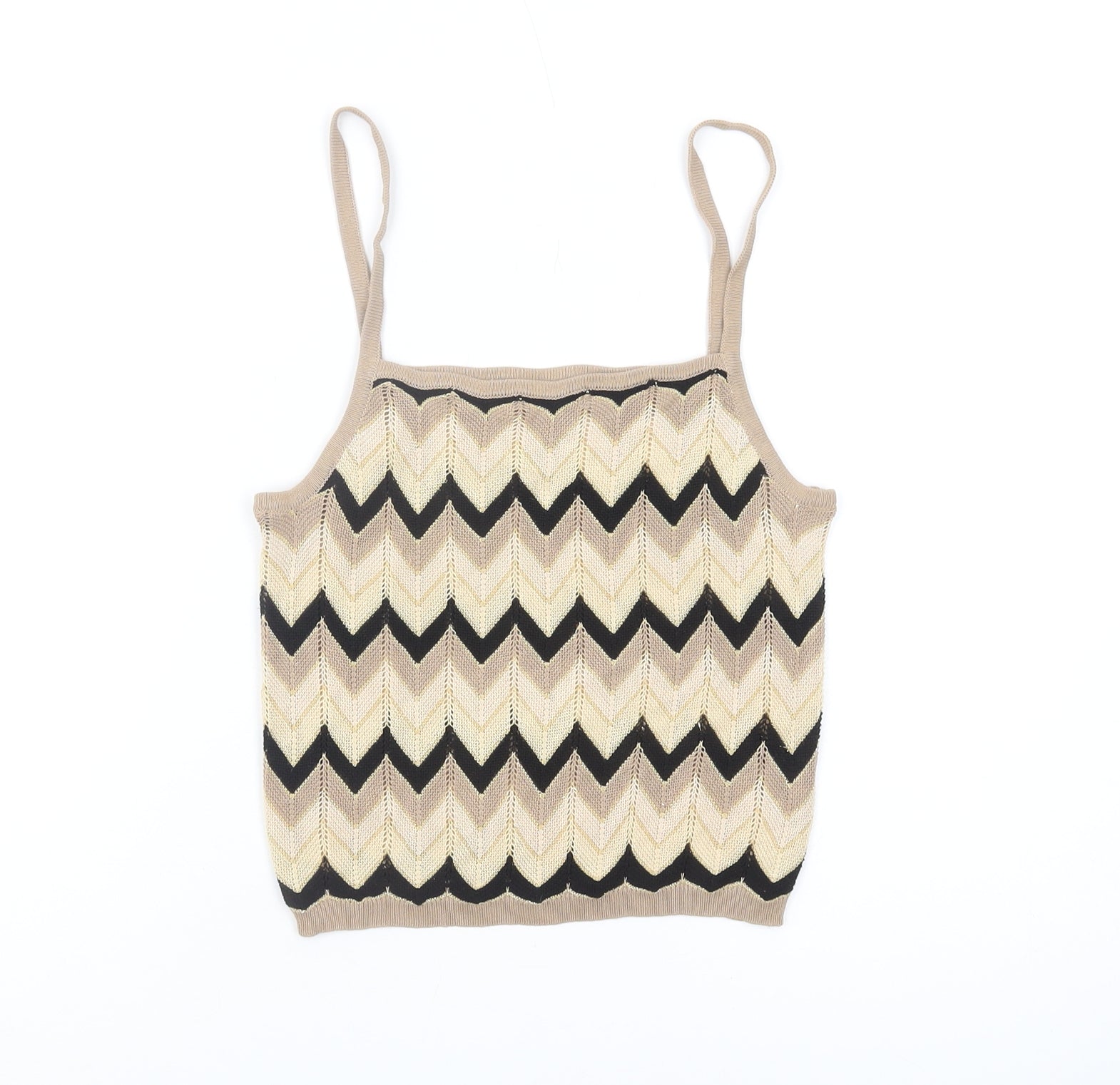 Upgrade your summer wardrobe with this MNG Women's Multicoloured Camisole Tank, perfect for casual outings. Crafted from a comfortable cotton and acrylic blend, this knit top features a striking geometric pattern in a palette of beige, black, and ivory hues. The square neckline and spaghetti straps add a touch of elegance, while the sleeveless design is ideal for warm weather. This camisole tank offers a relaxed and easygoing fit, making it suitable for various casual occasions. Despite being gently used, it remains in excellent condition and is an attractive choice for those looking to enhance their style effortlessly. Don't miss the opportunity to own this versatile and beautifully crafted piece.