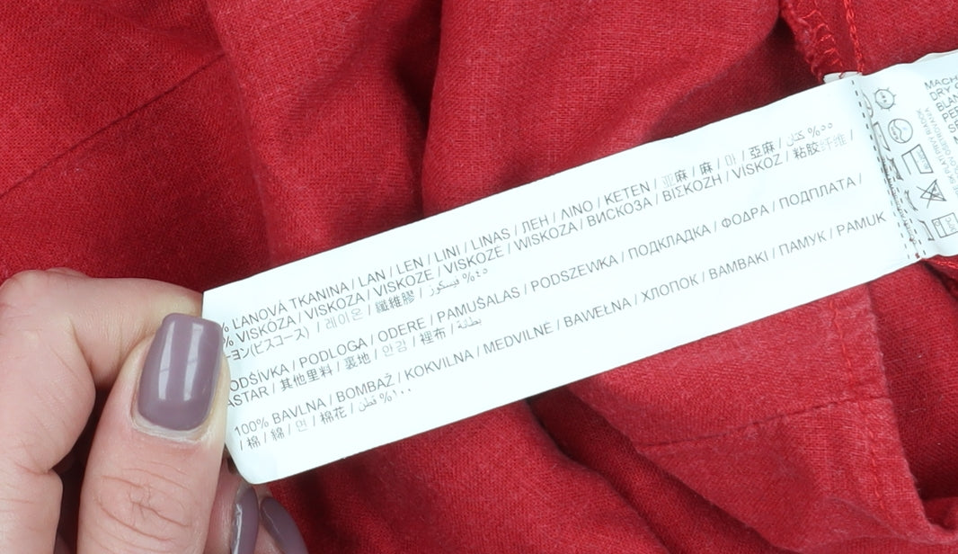 Introducing a vibrant addition to your summer wardrobe, the MNG Women's Red A-Line Midi Dress strikes the perfect balance between elegance and comfort. Designed for women who appreciate chic simplicity, this dress in a bold red hue is sure to turn heads. The sleeveless design and strappy sleeves make it a breeze to wear in warm weather, while the lightweight linen and viscose blend ensures you stay comfortable all day long. With a flattering V-neckline and an A-line silhouette, this dress accentuates your figure effortlessly. The tie closure at the back adds an elegant touch, making this dress ideal for casual outings or relaxed summer parties. Despite a small stain on the front, its overall condition is rated very good, making it a worthy purchase for fashion-forward individuals looking for quality on a budget. Machine washable for easy care, this dress is as practical as it is stylish. Upgrade your casual wear with this fabulous MNG dress and let your style shine.