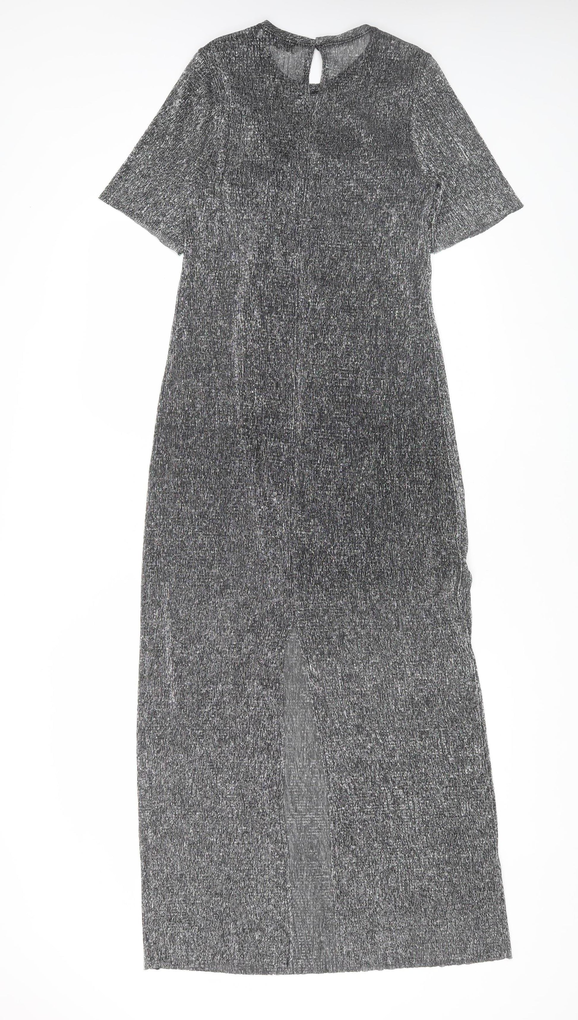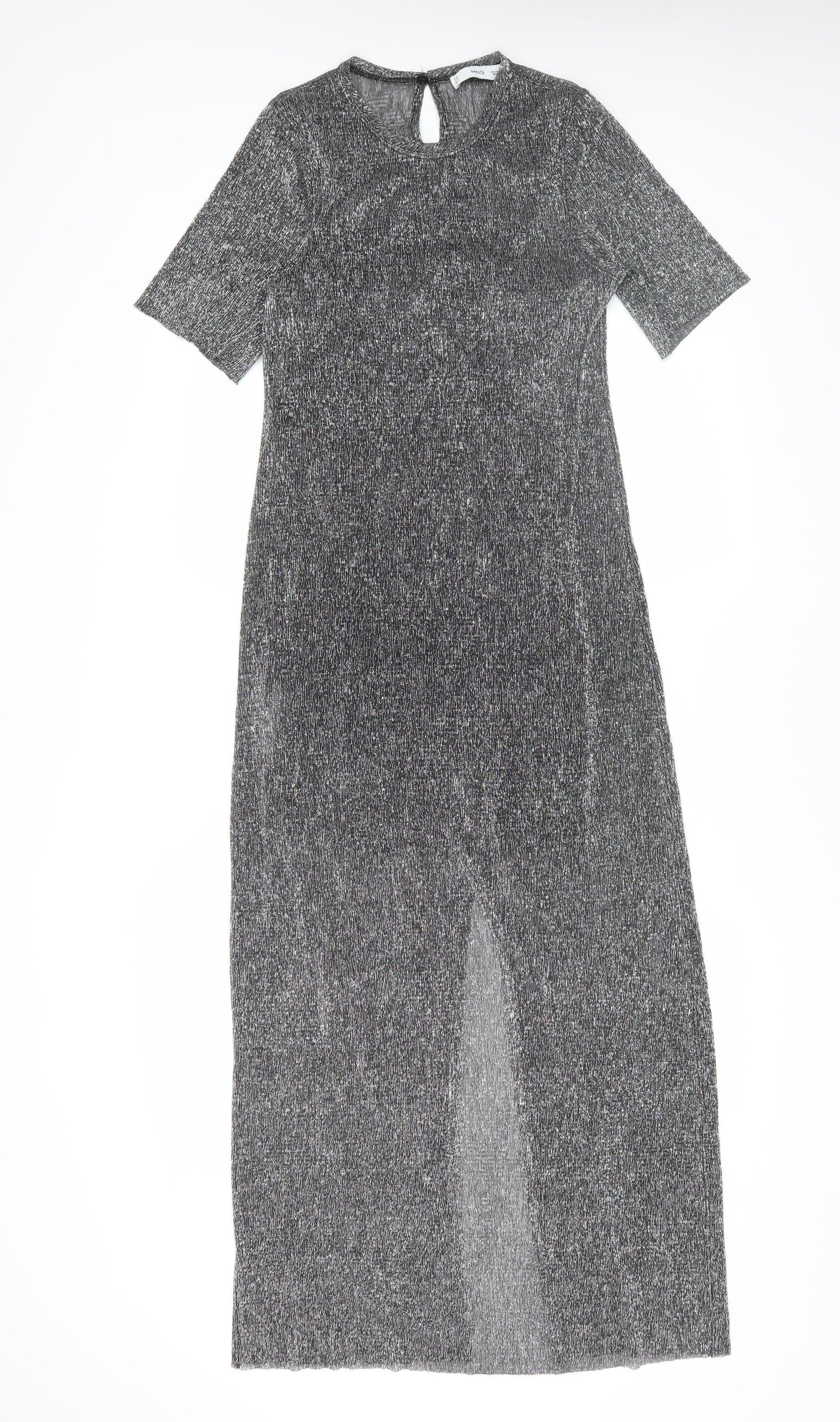Step into the spotlight with this elegant silver shift dress from MNG, perfect for any party or cocktail occasion. Designed for women, this midi-length dress exudes sophistication and style. The dress features a classic crew neckline and half sleeves, providing a comfortable yet fashionable look. Crafted from high-quality woven polyester, it ensures durability and a slight stretch for ease of movement. Ideal for autumn and winter, its metallic shimmer adds a touch of glamour suitable for evening events. This dress is in excellent condition with no visible wear, making it an excellent addition to your wardrobe. Pair it with statement earrings and sleek heels to complete your party-ready ensemble.