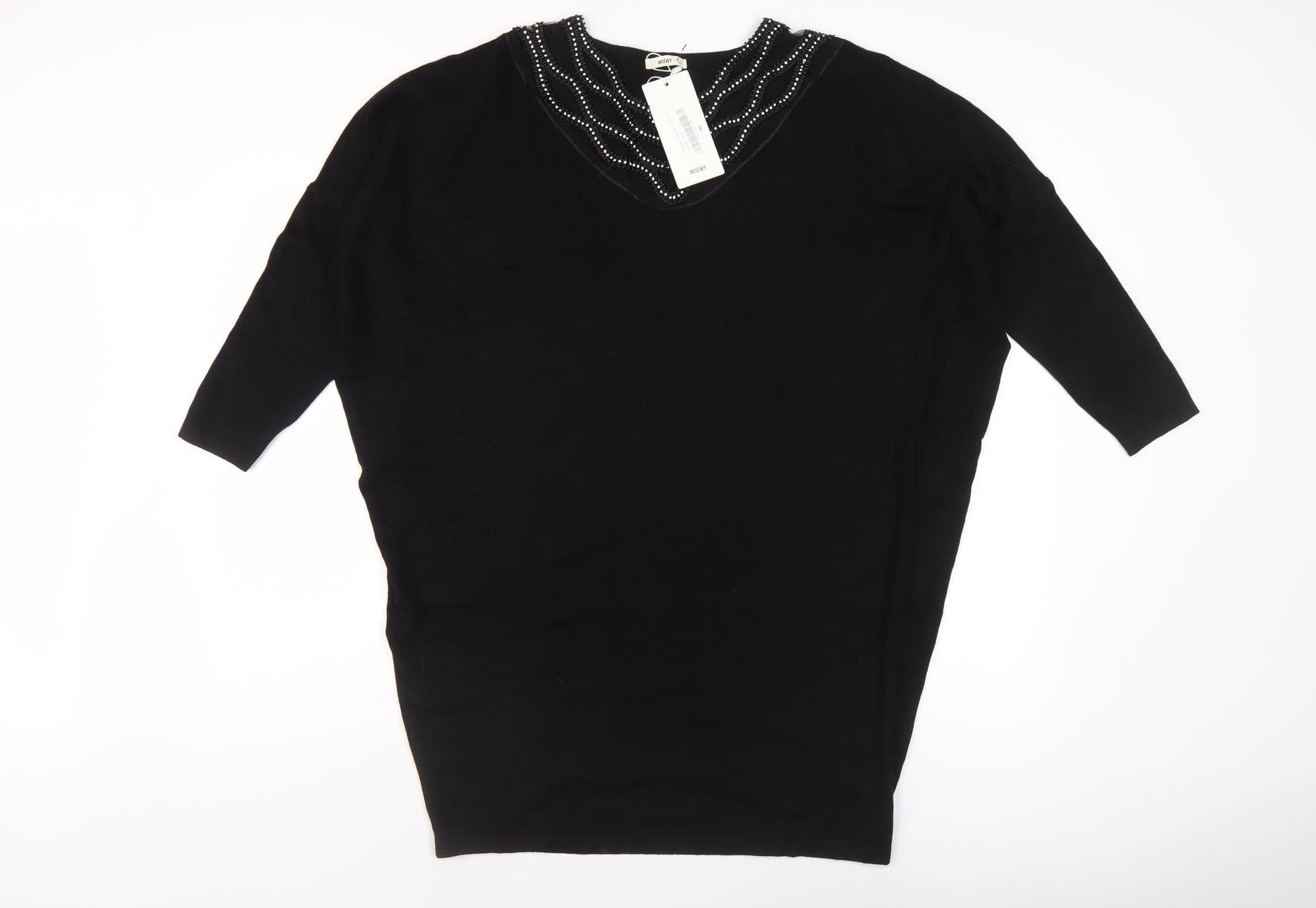 Discover timeless elegance with the Moewy Women's Black Jumper. Designed for versatility and comfort, this jumper features a captivating V-neck adorned with beaded accents, perfect for adding a touch of sophistication to any outfit. Made from a blend of viscose and polyester, it ensures a soft, breathable feel, ideal for both casual and formal occasions. The 3/4 sleeve design provides ease of movement while keeping you stylishly warm. Its simple, no-pattern finish allows for endless styling options. Perfect for women who appreciate quality and style, this piece is a must-have addition to your wardrobe.