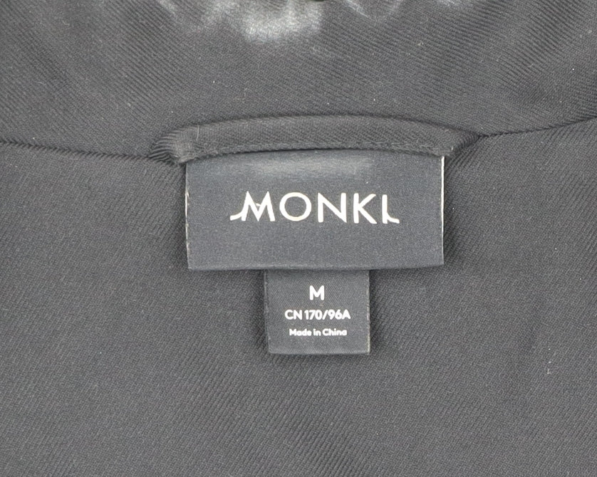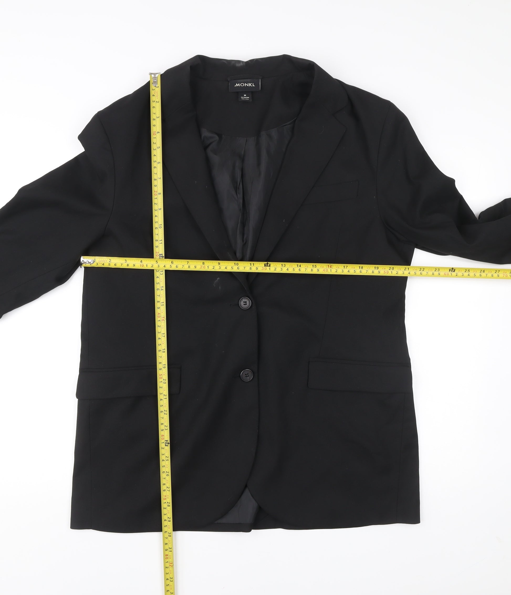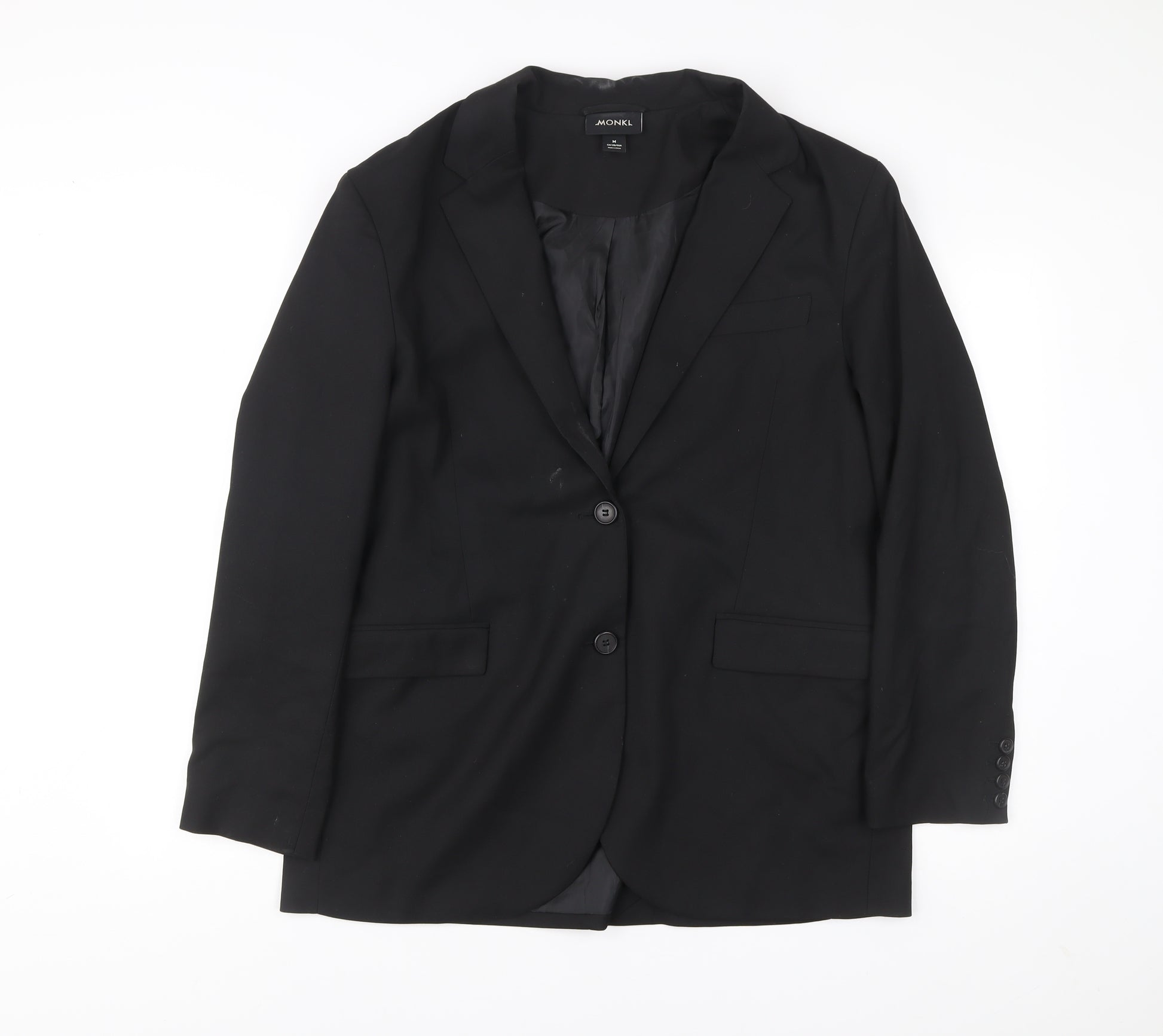 Elevate your wardrobe with this sleek Monki unisex black blazer, designed to deliver classic tailoring with a modern twist. Crafted with a carefully structured cut, this jacket is versatile enough for both business and formal occasions. The two-button front and notch lapel design create a timeless aesthetic, while the single-breasted construction ensures a refined silhouette. Finished with a single vent at the back, this blazer provides increased comfort and mobility while maintaining a tailored look.Made from a high-quality blend of 68% polyester, 30% viscose, and 2% elastane, the fabric strikes the perfect balance between durability, softness, and a subtle stretch for ease of wear. The lining is crafted from 100% polyester, offering a smooth fit over shirts or knitwear. Measuring as a UK medium with a chest size of approximately 38 inches, it is ideal for those who appreciate both function and form in a wardrobe essential.The blazer comes in a classic black colourway, making it a versatile choice that can be styled with dress trousers for business attire or paired with jeans for a smart-casual look. Inner pockets add practicality, offering discreet storage for small essentials. This piece has been gently worn and is in very good condition, with only light signs of wear and some lint visible, which does not affect its overall appeal.Perfect for the autumn and winter seasons, while still suitable for spring layering, this Monki blazer will seamlessly blend into your wardrobe rotation. Whether you are preparing for an important meeting, a formal event, or simply want a polished outfit for an evening out, this jacket is a reliable choice.Add a touch of refined tailoring without compromising comfort, making this Monki blazer a staple piece for versatile day-to-night styling. Don’t miss your chance to own a wardrobe classic.