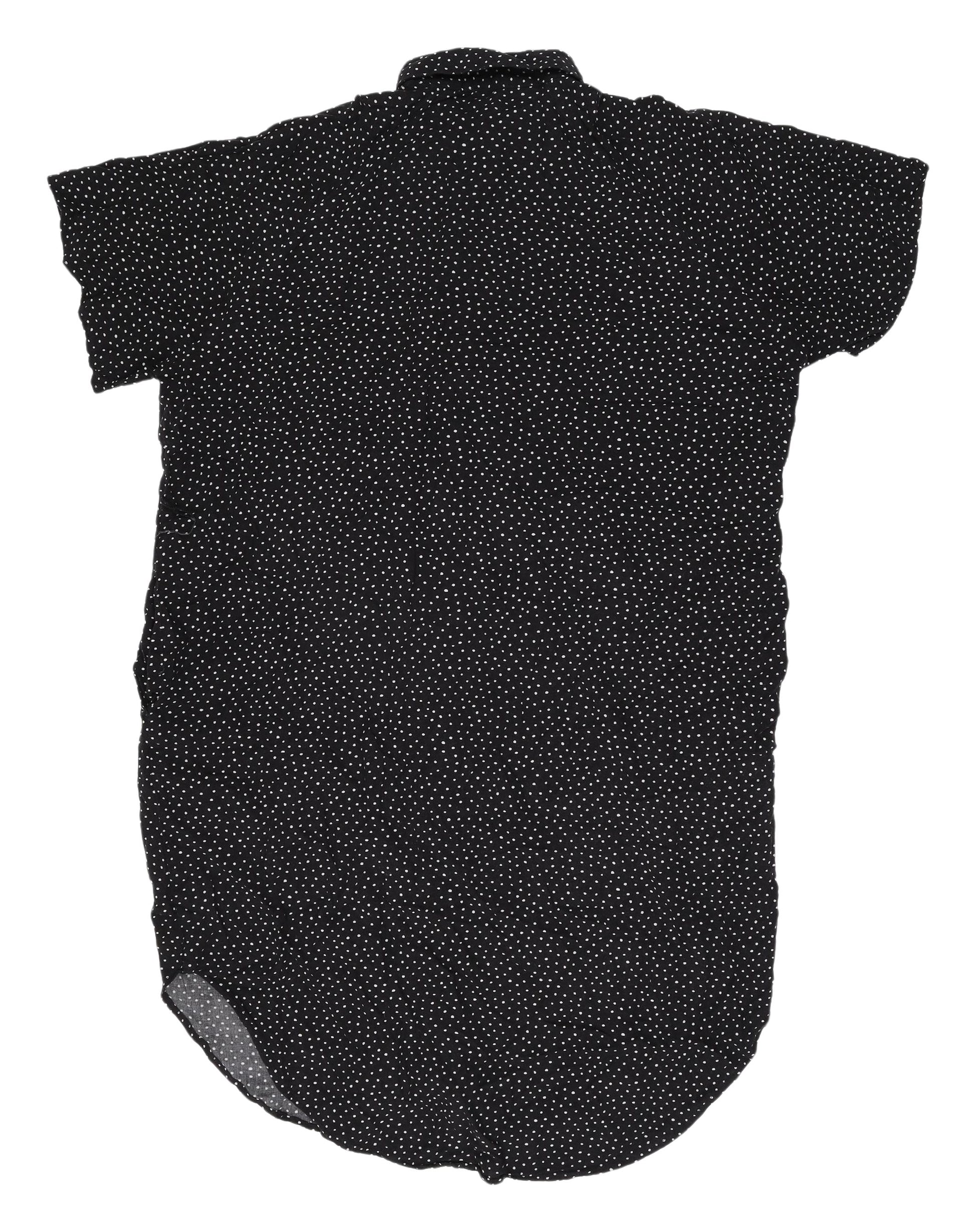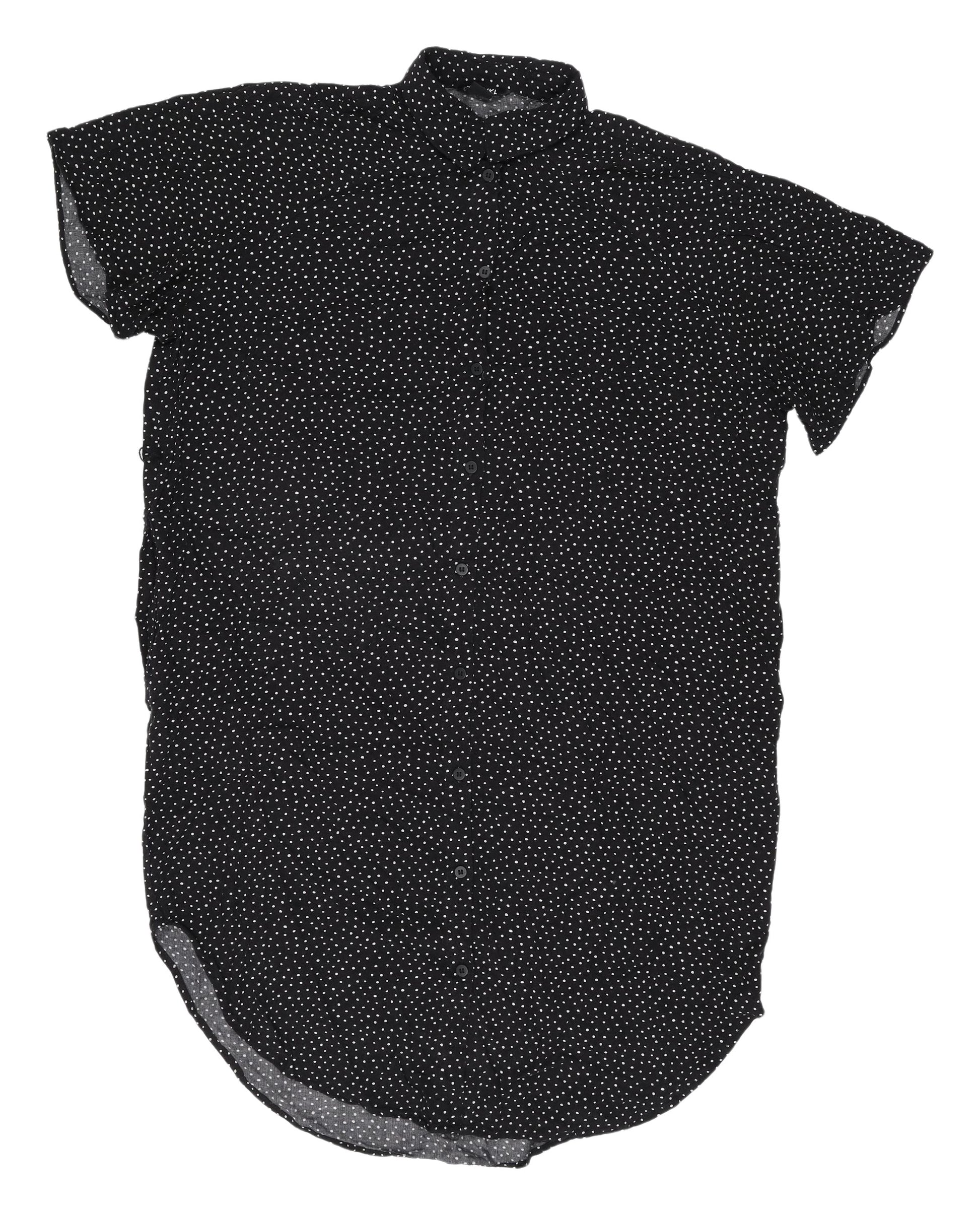 This versatile Monki Black Polka Dot Shirt Dress is perfect for your casual wardrobe. Crafted from soft viscose fabric, this dress is designed in a classic shirt dress style with a neat collar and short sleeves, ideal for sunny spring and summer days. Its charming polka dot pattern adds a playful touch, while the front button closure enables easy wearability. The lightweight woven fabric feels gentle against the skin, ensuring all-day comfort. Ideal for a casual outing or a day at the park, this dress promises both style and comfort. The monochrome palette offers endless styling possibilities, whether paired with sneakers for an effortless daytime look or dressed up with heels for a night out. The dress is machine washable for easy care, and while it is in excellent pre-loved condition, it maintains its quality and charm. Add this contemporary piece to your wardrobe for easy, stylish dressing throughout the seasons.
