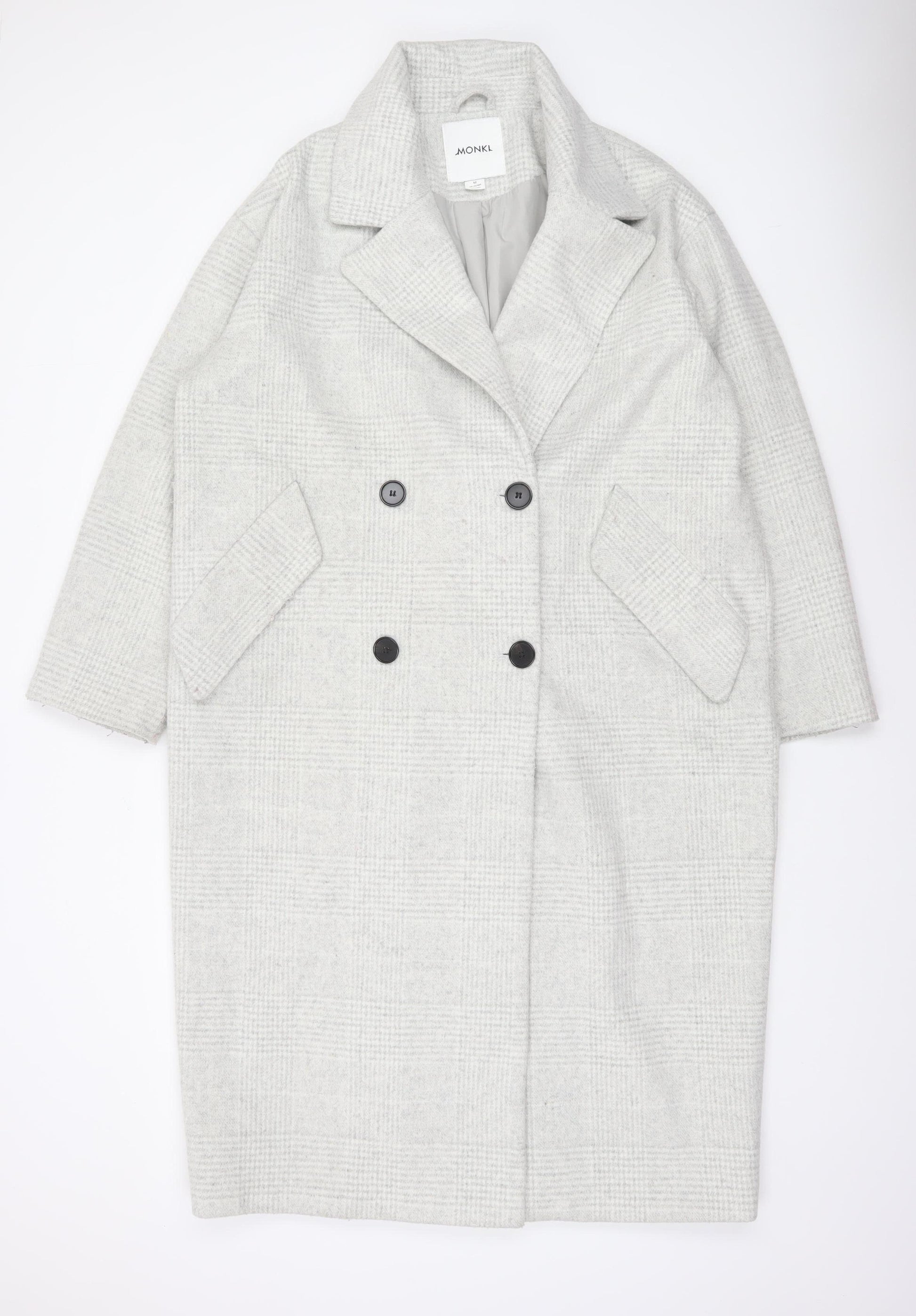 This elegant Monki wool blend coat is a perfect blend of modern simplicity and timeless style. Designed for women, the coat comes in a soft grey shade featuring a subtle checked pattern that lends a polished yet relaxed charm. Crafted from a high-quality blend of 77% polyester and 23% wool, it offers warmth, durability, and comfort, making it ideal for cooler weather during autumn and winter seasons. The long-length overcoat style provides a flattering silhouette that can easily be layered over workwear, smart-casual, or weekend outfits. The coat features a lined interior with smooth polyester for comfortable wear and effortless layering. Distinctive design features include a classic notched collar, front button fastening, and two practical flap pockets for added function and understated detail. Its relaxed fit ensures ease of movement while maintaining contemporary sophistication. With its versatile grey tone and minimal design, this Monki overcoat pairs beautifully with both tailored trousers and denim, making it a multi-season wardrobe essential. Carefully tailored for a comfortable Regular fit, it suits UK size 12, equivalent to the labelled size M (170/96A). The coat has been gently handled and remains in Excellent condition with no visible flaws or damage. Ideal for women who appreciate minimalist Scandinavian-inspired design, this Monki coat delivers practicality, aesthetic appeal, and long-lasting style. Add it to your outerwear collection for a refined look that transitions seamlessly from workday professionalism to weekend casual sophistication.