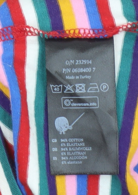 Bring a splash of colour and playful energy to your wardrobe with this Monki Women’s Multicoloured Striped Roll Neck Top. Designed in a rainbow stripe pattern, this cheerful piece instantly brightens any outfit while keeping comfort and style front of mind. Made from a soft and breathable jersey fabric, the top features a cotton-rich composition with 6% elastane for a gentle stretch and a flattering, figure-hugging fit. The roll neck adds a touch of retro flair, ideal for layering or wearing on its own for a bold yet casual look. Perfect for autumn, winter, or those crisp spring days, its long sleeves ensure warmth while maintaining lightweight comfort. The classic fitted sleeve and regular fit make this a versatile addition to your daily wardrobe, blending effortlessly with jeans, skirts, or dungarees. Machine washable and easy to care for, this top combines durability with fuss-free maintenance. Whether you’re dressing for a laid-back day out, heading to work, or simply staying cosy at home, this Monki striped top delivers effortless charm. Subtle stretch and breathable cotton fabric provide all-day comfort, while the vivid stripes offer a timelessly fun aesthetic. A great choice for those who love a colourful, casual, and slightly retro look that can be layered under blazers or denim jackets for a touch of personality. In excellent condition with minimal signs of previous wear, this piece is a must-have for lovers of vibrant, comfortable everyday fashion.