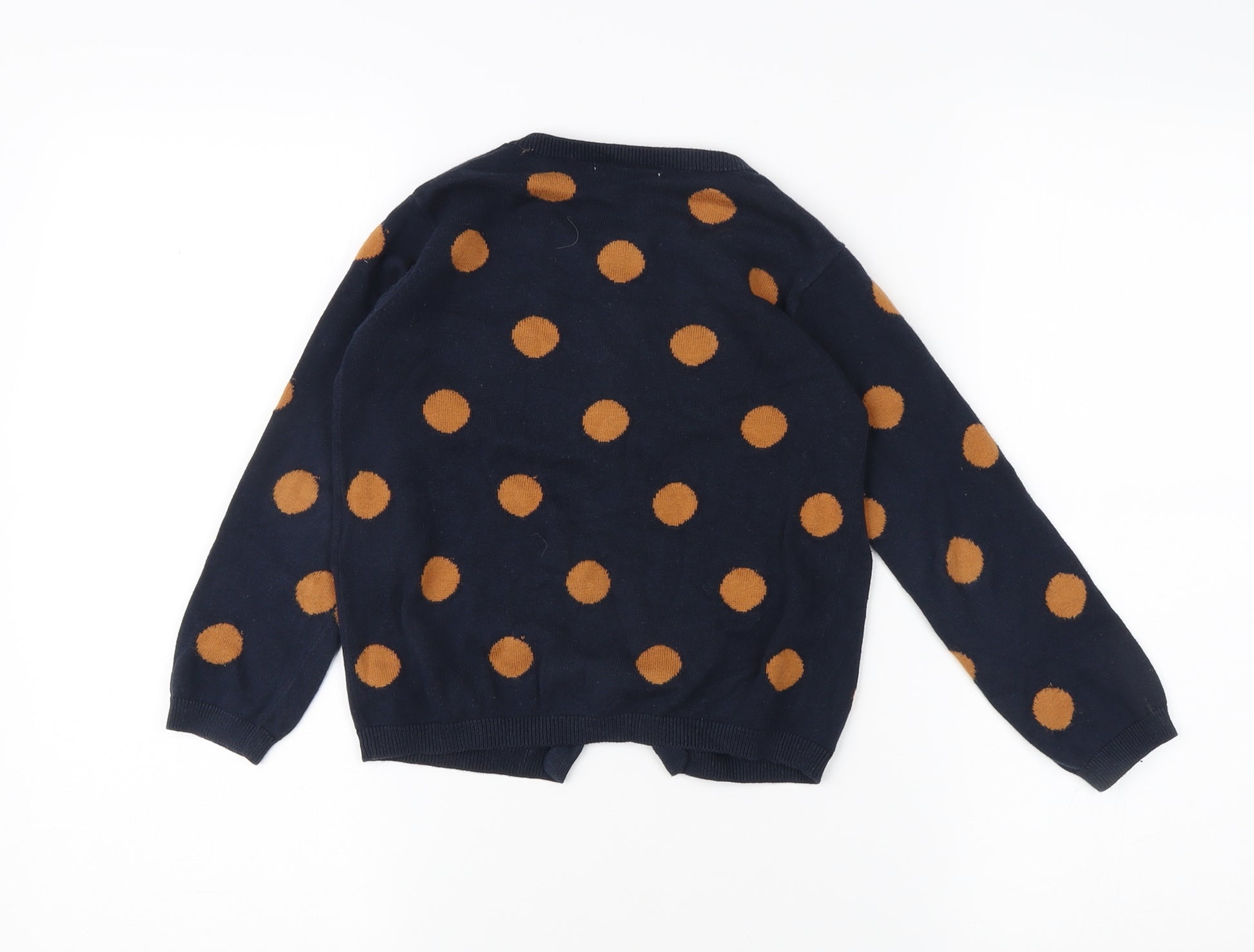 Delightfully stylish, this Monoprix Kids Girls Black Polka Dot Cardigan is perfect for your little one's wardrobe. Crafted from 100% cotton, this comfortable knit cardigan is ideal for keeping warm during the crisp months of autumn and winter. The charming polka dot pattern, featuring a rich black backdrop highlighted with playful dots, adds a fun and fashionable twist to any outfit.Designed with a convenient crew neck and long sleeves, this cardigan ensures a cozy fit, making it well-suited for daily wear and various casual occasions. It closes with secure buttons down the front, providing ease of dressing. Exceptional for its easy-care nature, this cardigan is machine washable, offering practicality along with style.Whether layered over a dress for special outings or paired with jeans for a chic casual look, this cardigan is certain to enhance your child’s ensemble. Although pre-loved, this piece is in excellent condition with no visible signs of wear, ensuring it remains a treasured addition to any girl's clothing collection.Elevate your child's fashion sense with this adorable and versatile Monoprix Kids cardigan, designed to infuse both warmth and charisma into every day. The lightweight feel and delightful design make it a must-have for the season. A wonderful gift idea for any parent looking to refresh their child's wardrobe with practicality and aesthetic appeal, this cardigan promises to be a go-to favourite.