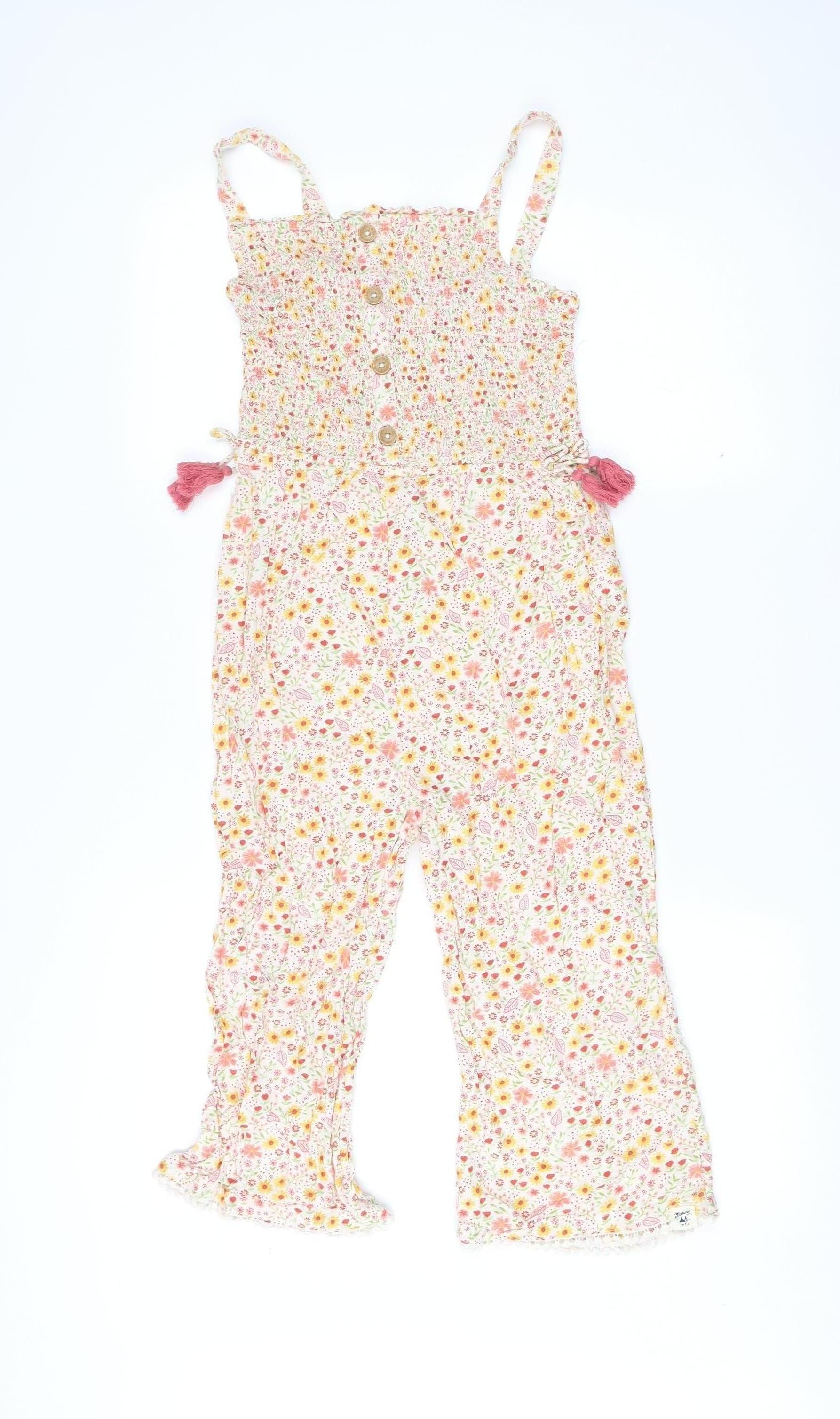 Brighten up your child’s wardrobe with this delightful Monsoon girls’ floral jumpsuit, perfect for adding a touch of fun and charm to everyday dressing or special occasions. Designed especially for girls in age 12 years, this lovely one-piece features a lively multicoloured floral print with shades of pink, yellow, orange, and green, beautifully arranged against a light woven viscose fabric. With its sleeveless cut and adjustable straps, it offers comfort and flexibility for growing wearers, while the lightweight breathable material ensures comfort during warmer spring and summer days.The square neckline adds a touch of modern style, and the button front detail enhances the playful character of this jumpsuit. A drawstring tie with tassel accents adds a sweet finishing feature, bringing together both style and functionality. Monsoon is well known for its finely crafted and fun-to-wear designs, and this piece effortlessly captures that ethos, making it suitable for both casual wear and festive occasions like parties, holidays, or family gatherings.Made from 100% viscose, this jumpsuit is soft, flowing, and designed to keep your child cool in warmer seasons, while also being easy to care for as it is machine washable. The woven construction gives it a natural drape and finish that moves beautifully. Ideal as a casual daytime outfit or dressed up with a cardigan or summer sandals for parties, it gives versatility for many occasions.In excellent pre-loved condition, this item shows no obvious signs of wear, stains or flaws, though it no longer comes with the original retail sales tags. It has been lovingly preserved and remains a stylish, vibrant, and practical choice for your little one’s wardrobe.This Monsoon floral jumpsuit blends fun, colour and comfort, making it a reliable favourite for both parents and children. Its adaptable style ensures it can be worn again and again through seasons of sunshine and celebrations, providing fantastic value and timeless appeal.
