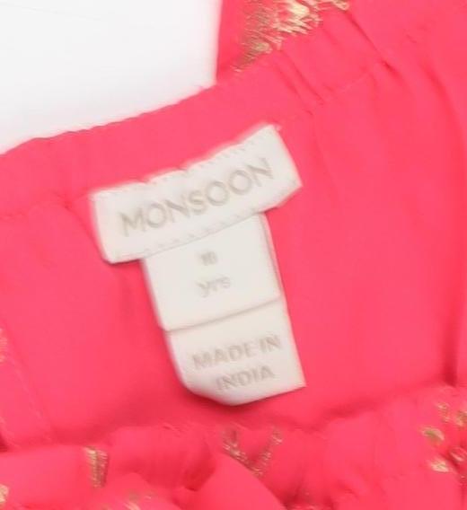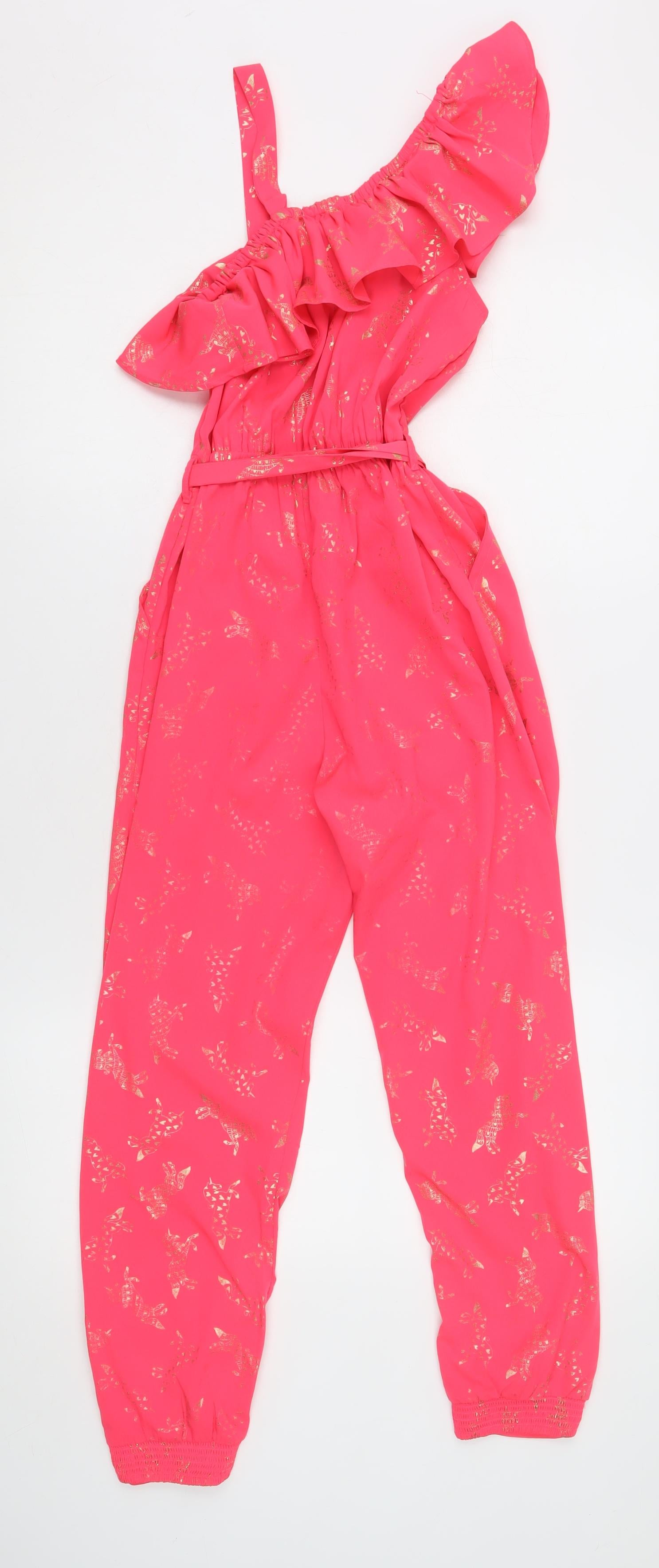 Bring some bright flair to your child's wardrobe with this charming Monsoon jumpsuit. Perfect for girls aged 10 years, this delightful piece combines both style and comfort effortlessly. Crafted in a vibrant pink with delicate golden prints throughout, it's an excellent choice for parties or special occasions. The one-shoulder ruffle detail adds a playful touch, while the elastic waist ensures a snug, flexible fit. Ideal for the summer months, the sleeveless design keeps things cool, and the soft material ensures all-day comfort. Pair it with sandals for a complete look that's sure to turn heads. This pre-owned jumpsuit is in excellent condition, reflecting its quality and care.