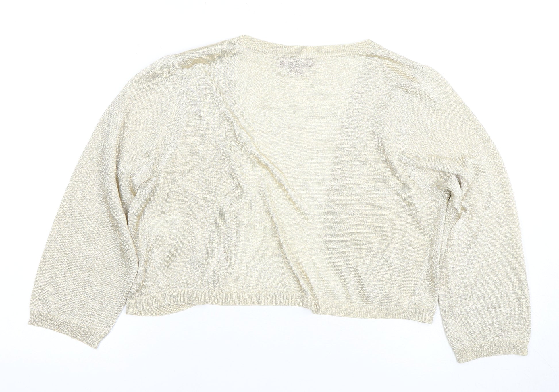 Elevate your wardrobe with this stylish Monsoon blouse, perfect for women who love a touch of elegance in their casual attire. This beige top, designed for a regular size 14 fit, offers comfort and sophistication in equal measure. The shirt features a classic cropped style and a solid pattern that's easy to match with any outfit. Crafted from a luxurious knit fabric comprising viscose, polyester, and a hint of metallic fibre, it ensures a soft feel against your skin while providing a subtle shimmer for added appeal.Ideal for casual occasions, this blouse can be paired effortlessly with jeans or a skirt for a relaxed yet chic look. Its open neckline lends a breezy touch, perfect for warmer days or layering under a jacket during cooler seasons. Although gently worn, it remains in very good condition, making it a valuable addition to your collection.This Monsoon blouse is not just a piece of clothing but a statement of style and grace. Whether for a day out in the city or a leisurely afternoon with friends, it assures you of turning heads with its understated elegance. Grab this versatile top now for a touch of timeless fashion versatility.