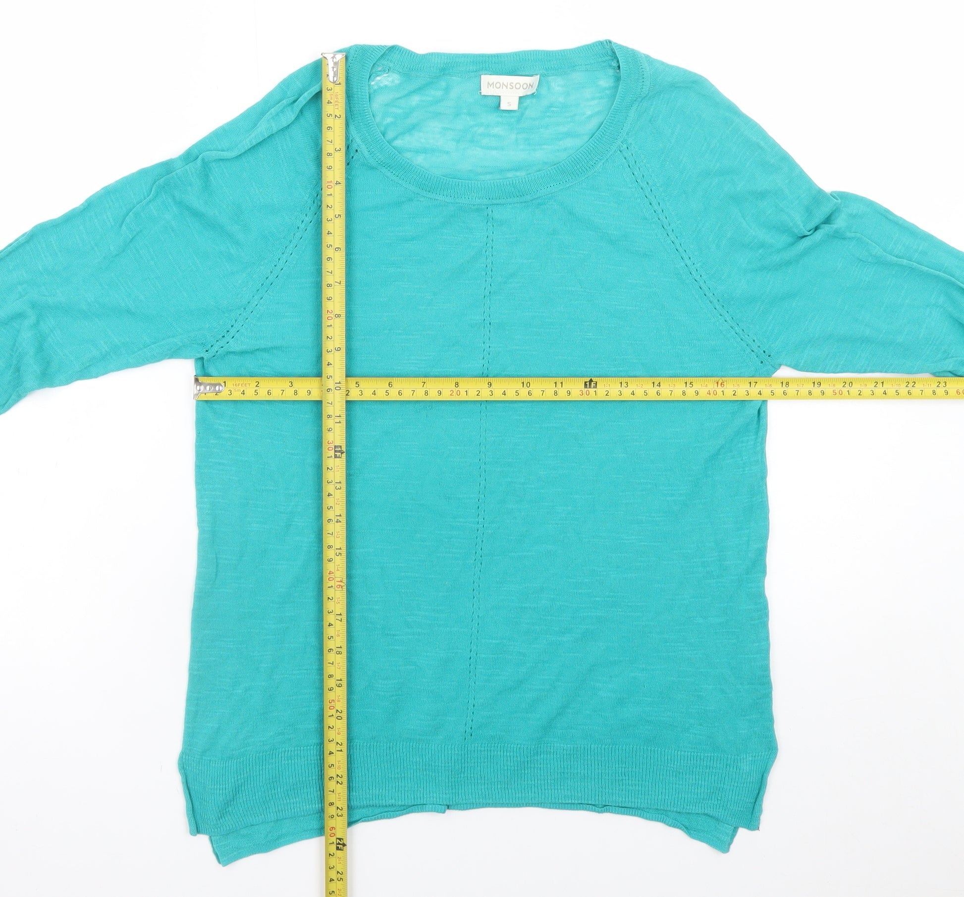 Refresh your wardrobe with this lovely Monsoon women’s green pullover jumper, crafted from soft 100% cotton for everyday comfort. The vibrant green tone adds a touch of freshness to any outfit, perfect for casual looks throughout the spring, summer and autumn seasons. Designed with a flattering crew neckline and 3/4 length raglan sleeves, it’s a lightweight and breathable knit you can layer or wear on its own. The fine tight-knit finish provides a smooth texture and durable wear, maintaining its shape with ease. This jumper showcases Monsoon’s timeless quality and attention to detail, ideal for pairing with jeans, skirts or relaxed trousers for effortless style. The hemline features subtle ribbed detailing to enhance fit and comfort. Though gently used, it remains in excellent condition with minimal signs of wear. A versatile addition to your knitwear collection, offering both sophistication and practicality. Machine washable for easy care, this Monsoon green jumper is the ultimate blend of comfort and contemporary charm – a must-have for those who appreciate stylish simplicity and reliable quality. Perfect for layering on cool evenings or adding a pop of colour to your daywear, this piece transitions beautifully across multiple occasions – from casual workdays to relaxed weekends. Bring home this essential knit and enjoy its timeless look for many seasons ahead.