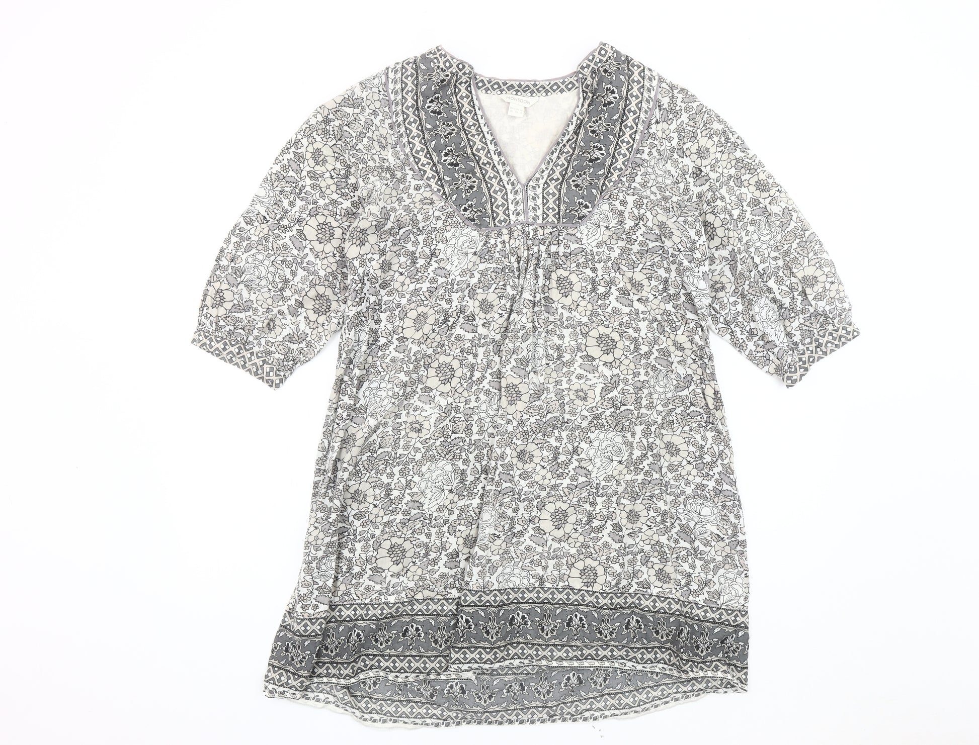 Add a touch of elegance to your wardrobe with this beautiful Monsoon floral tunic top. Muted in a sophisticated grey and adorned with a delicate floral pattern, this blouse combines both style and comfort effortlessly. The tunic top features an eye-catching V-neckline and 3/4 sleeves, making it perfect for those warm spring and summer days. Crafted from 100% cotton, it promises breathable comfort and is machine washable, ensuring ease of care. Whether you're seeking something stylish for a casual outing or a stroll in the park, this top fits the bill expertly, offering a relaxed feel without compromising on style. The flattering tunic style highlights your figure gracefully, while the floral design underscores a timeless femininity. Pair it with your favourite trousers or a denim skirt for a chic, put-together look. Available in a UK size 10 and suitable for the regular fit, it suits the woman seeking classic style with a modern twist. Grab this versatile piece and make it a staple in your casual wardrobe today.