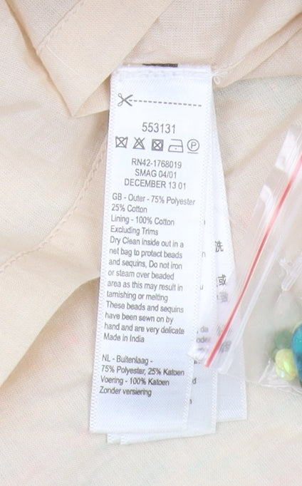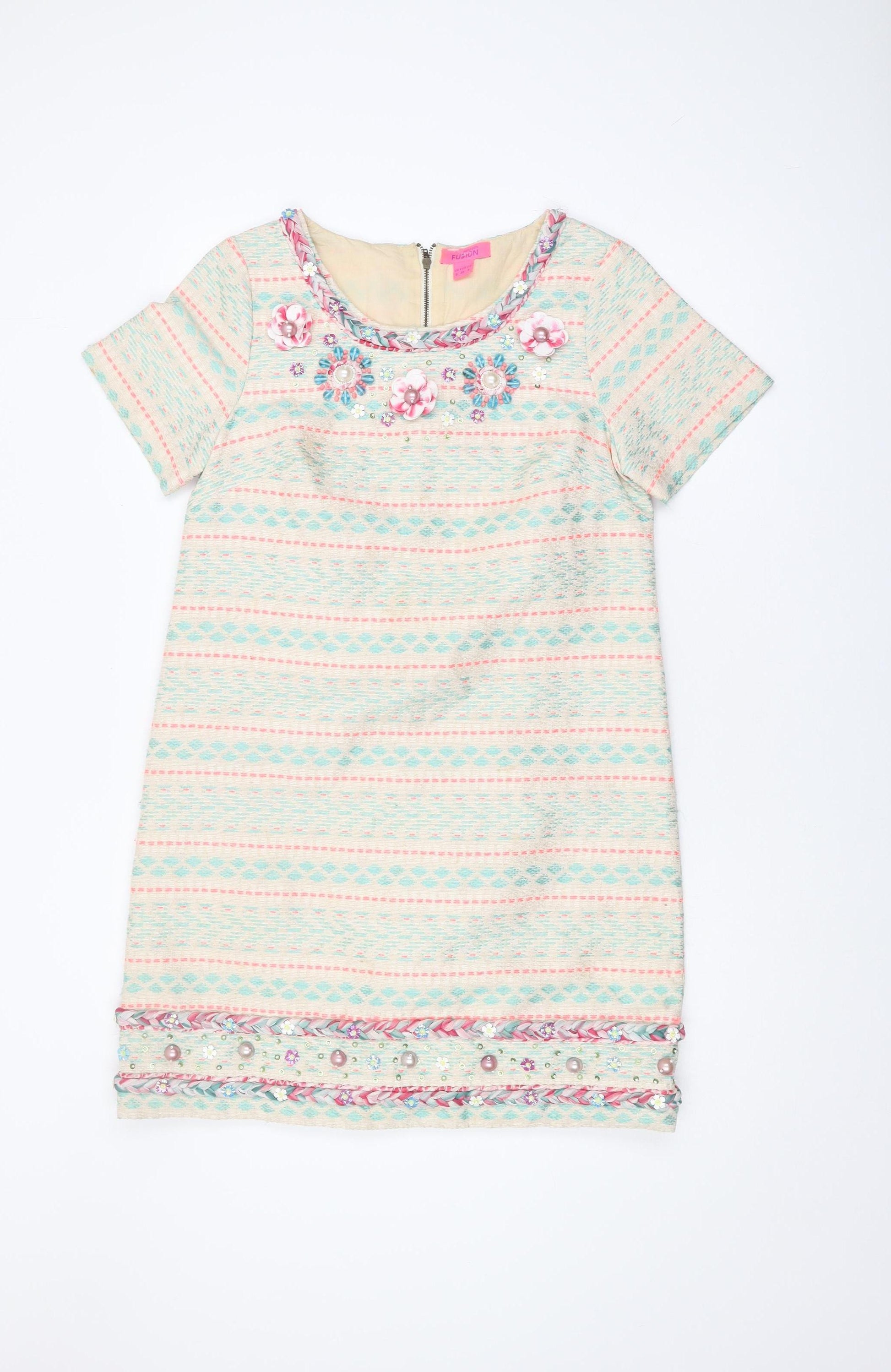 Step into style with this eye-catching Monsoon shift dress, perfect for casual outings or party occasions. Designed in a playful multicoloured geometric print, this short dress effortlessly blends comfort with fashion. The soft, woven fabric features a luxurious lining, ensuring you feel comfortable and confident all day. The intricately embroidered and beaded accents add a touch of glamour, making it easy to transition from day to night. This dress boasts a modest round neckline and convenient short sleeves, ideal for the warmer spring and summer months. Zip closure at the back allows for a perfect fit, keeping you chic and secure. Tailored in a size 8 regular, it is versatile enough for a range of occasions, from casual gatherings to cocktail parties. Crafted from a durable mix of polyester and cotton, this dress is bound to be a favourite in your collection. Made by Monsoon, the brand known for quality and modern designs, it pays homage to their commitment to style. Despite its intricate detailing, garment care is hassle-free with dry clean only instructions. Pair with sandals or heels and a clutch bag for a complete ensemble that steals the spotlight. Grab this elegant piece while you can, and watch as it becomes your go-to choice for any day you wish to feel fabulous.