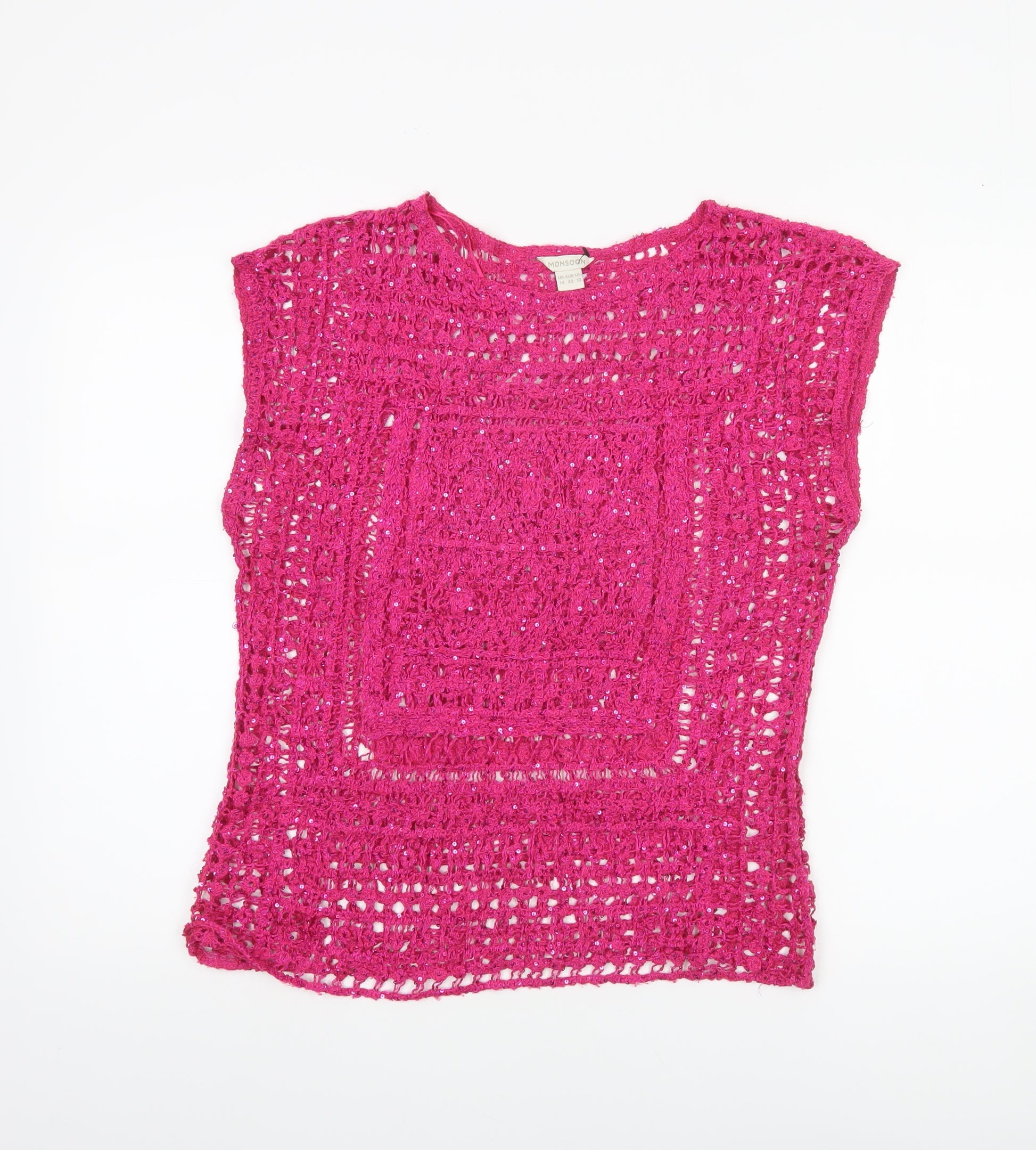 Add a splash of summer charm to your wardrobe with this stunning Monsoon Women’s Pink Crochet Sequin Sleeveless Blouse in size 14. Crafted from 100% acrylic, this lightweight and breathable piece embodies easygoing elegance with its soft open-crochet design that drapes beautifully against the body. The bright pink hue brings a statement pop of colour, while delicate small sequins are subtly woven throughout to add a gentle shimmer under the light. The simple pullover design, relaxed regular fit, and sleeveless cut make it a versatile choice for layering over camisoles, swimwear, or pairing with light jeans for a cool, bohemian-inspired style. The crew neckline keeps the look polished yet casual, ensuring it transitions easily from day trips and holidays to warm evening social events. The intricate crochet fabric and subtle sequin accents embody Monsoon’s signature attention to detail and artisan flair, creating a piece perfect for summer getaways or casual lunches. Ideal for the warmer seasons, this blouse offers both comfort and style, enhancing your look with flair and individuality. In excellent pre-owned condition with light wear and no visible flaws, this quality piece remains in beautiful shape—ready to revitalise your wardrobe. Pair it with white linen trousers, denim shorts, or a flowing skirt for maximised outfit potential. Whether worn for casual afternoons, holidays, or relaxed garden parties, this Monsoon top adds personality and confidence to any outfit, ensuring you look effortlessly stylish wherever you go. A charming piece designed for women who appreciate vibrant colour, crochet detailing, and comfortable elegance.