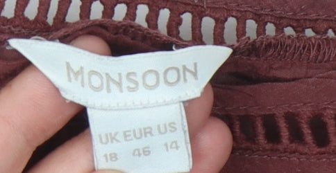 Discover casual elegance with this exquisite women's top from Monsoon. Featuring a stylish round neckline and classic fitted 3/4 sleeves, this piece is perfect for any everyday ensemble. The rich red hue adds a bold splash of colour to your outfit, while the intricate embroidery offers a touch of sophistication and detail that sets this top apart. Crafted from 100% cotton, it ensures comfort and breathability, making it an excellent choice for casual occasions. Although it comes in very good used condition, with some slight wrinkles from storage, its real charm lies in its simplicity and versatility. Ideal for pairing with jeans or skirts, this Monsoon top is both machine washable and easy to care for, promising convenience alongside its chic appearance. Priced affordably, this is a must-have addition to any woman's wardrobe looking to merge comfort with style effortlessly.