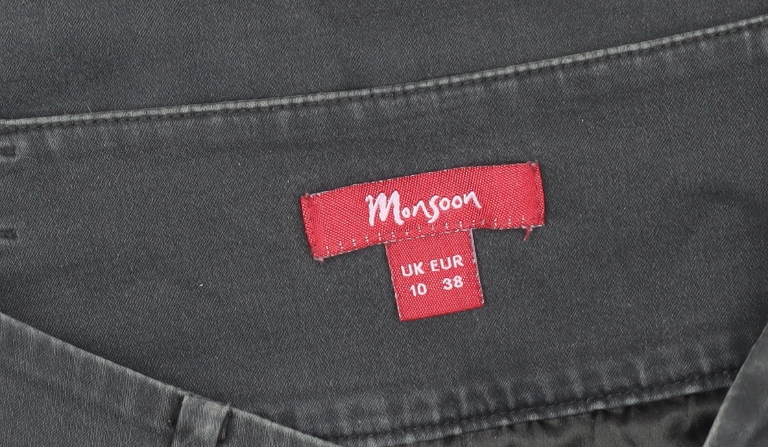 This elegant black pencil skirt from Monsoon is an essential addition to any wardrobe, perfect for a chic look. Crafted in a flattering mid-rise fit, this skirt offers a classic straight and pencil style that ensures a sophisticated silhouette. The subtle elegance of this design makes it versatile for various occasions, be it office wear or a casual outing. Convenient pockets add functionality without compromising on style. Ideal for women seeking a balanced blend of comfort and fashion. Don't miss out on this stylish staple in excellent condition, perfect to pair with your favourite tops.