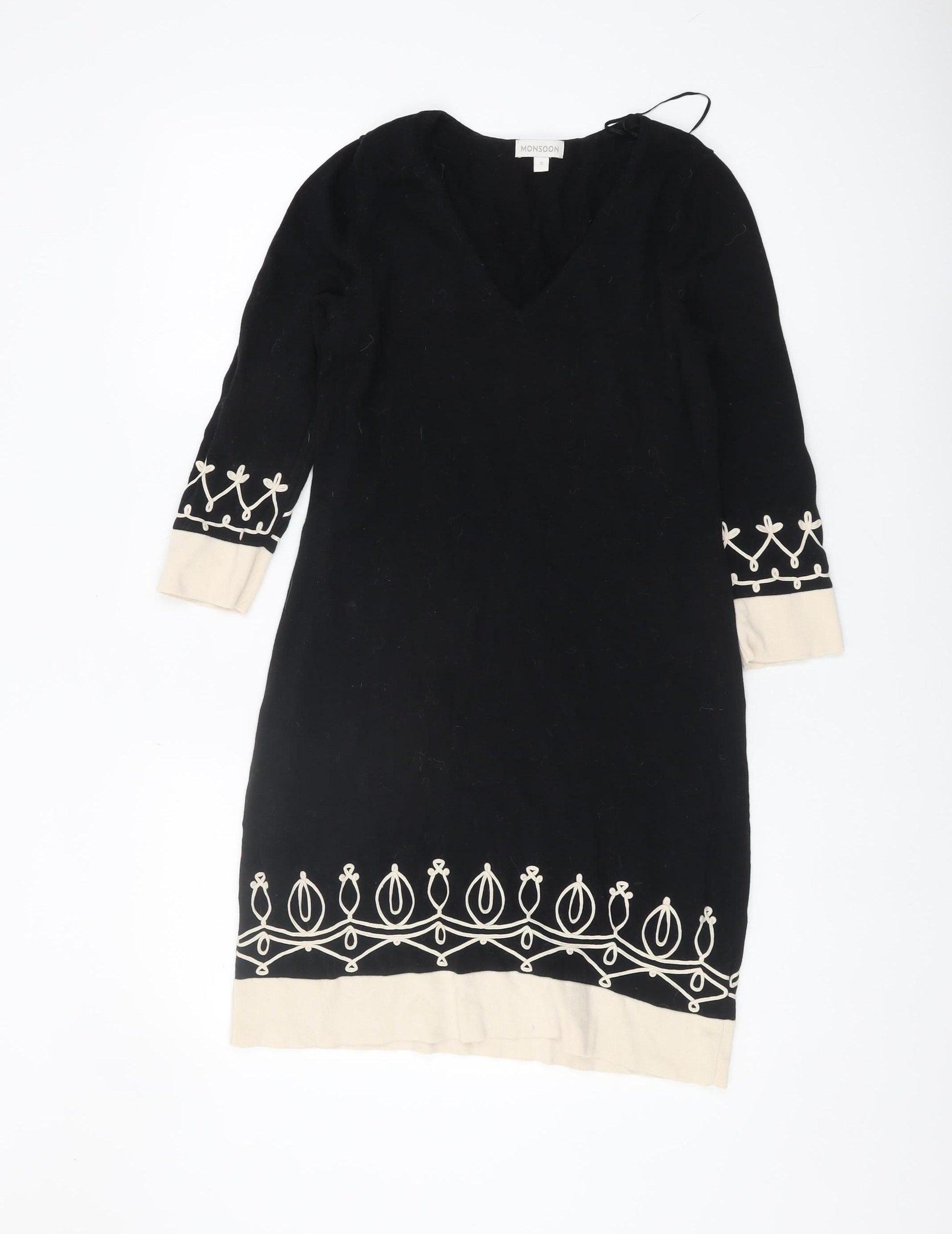 Explore timeless elegance with this Monsoon Women's Black Tunic Jumper. Crafted from 100% pure cotton, this exquisite piece combines comfort with sophistication. Its versatile V-neck design and eye-catching embroidered accents along the sleeves and hem create a unique, stylish silhouette. Perfect for achieving a casual yet refined look, this tunic jumper is suitable for any occasion. Tailored to provide a flattering fit, its 3/4 sleeves add a touch of elegance, making it an ideal choice for both work and leisure. Despite being in excellent condition, it shows no visible signs of wear, ensuring you enjoy luxury and durability. Pair it with your favourite jeans or leggings to effortlessly elevate your wardrobe. Make this black tunic jumper a staple piece in your collection and enjoy limitless styling possibilities.