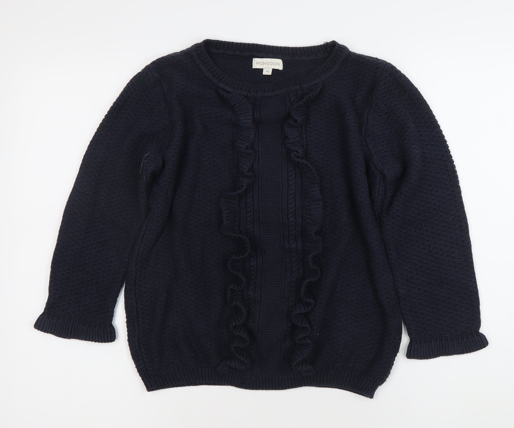 Elevate your seasonal wardrobe with this charming Monsoon women’s cable-knit pullover jumper in a classic deep blue shade. Crafted with style and comfort in mind, this medium-sized jumper is the ultimate blend of timeless design and versatile wearability. The crew neck offers a flattering, easy-to-layer neckline ideal for transitioning from autumn into winter, while the luxurious knit texture ensures cosy warmth without compromising on sophistication.A standout feature of this Monsoon jumper is the delicate ruffle accents running along the front, adding a feminine flourish to an otherwise classic cable-knit style. The long sleeves provide essential coverage for cooler months, making it a practical choice for everyday wear, whether you’re heading to the office, meeting friends for coffee, or enjoying a weekend walk. The deep blue colour is a versatile wardrobe staple, pairing effortlessly with jeans, tailored trousers, or skirts for a range of casual and smart-casual looks.Designed for comfort and a regular fit, this jumper combines the relaxed ease of knitwear with a touch of elegant detailing, making it perfect for women seeking both practicality and charm in their clothing choices. Its medium sizing offers a flattering fit for a variety of body shapes, while the absence of bold patterns keeps the design understated yet stylish, allowing the texture and detailing to take centre stage.This piece is in excellent pre-loved condition, showing minimal signs of wear with no visible damage, ensuring many more seasons of enjoyment. An ideal choice for autumn and winter styling, it’s a must-have for those who appreciate quality knitwear with subtle statement details.Whether worn layered over a crisp shirt or simply on its own, this Monsoon jumper is a versatile piece that will serve as a go-to favourite. Add it to your collection today and embrace effortless style and warmth this season.
