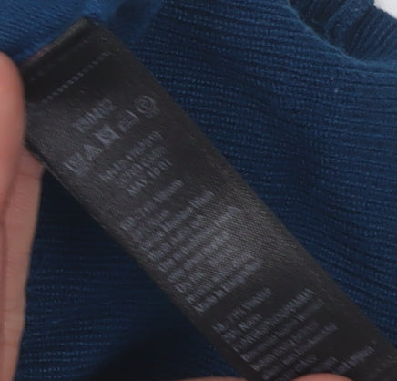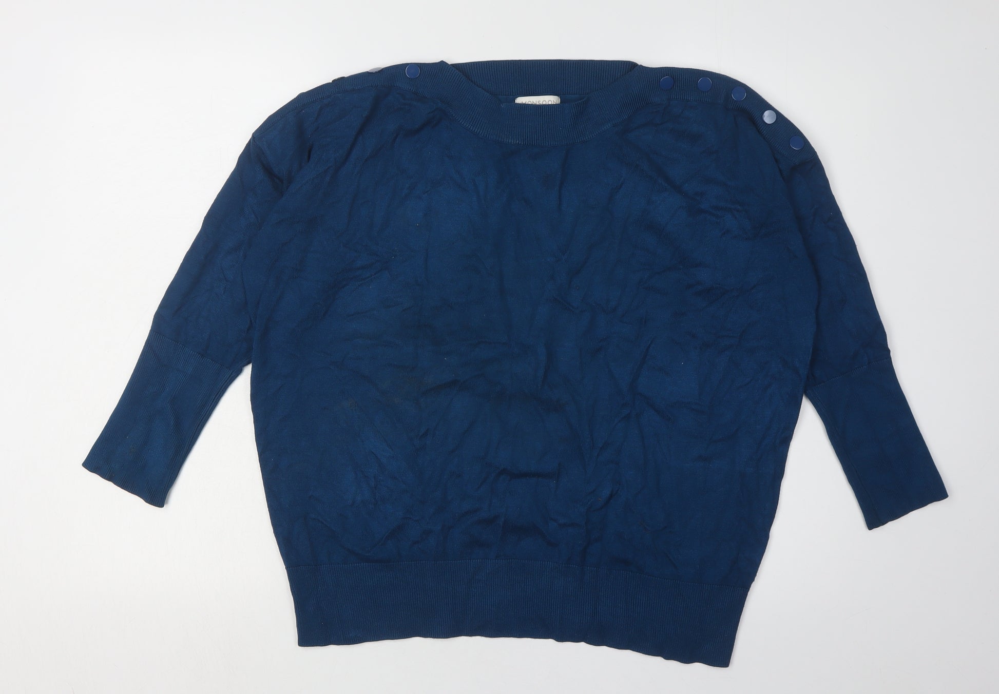 Dive into comfort with this Monsoon Women's Blue Crew Neck Jumper, perfect for the chillier months of autumn and winter. Crafted in a snug tight-knit style from a cotton blend, it promises warmth and breathability. The classic crew neck and practical 3/4 sleeves with fashionable raglan design make it a versatile addition to your wardrobe. This jumper's elegant blue hue pairs effortlessly with both casual and smart casual ensembles. Accent buttons add a subtle charm without overpowering its clean aesthetic. Although it presents no visible patterns, its simple design is ideal for layering or making a minimalistic statement. Machine washable for your convenience, this jumper ensures low maintenance yet high style. It's available in a regular size L, catering to comfort and a regular fit. While bearing no original tags, it remains in excellent condition with only slight fabric wrinkles. Whether you're heading out for a casual day with friends or simply enjoying a relaxed evening at home, this jumper is your go-to choice. Its versatility and comfort make it a must-have for any fashion-forward woman's collection.