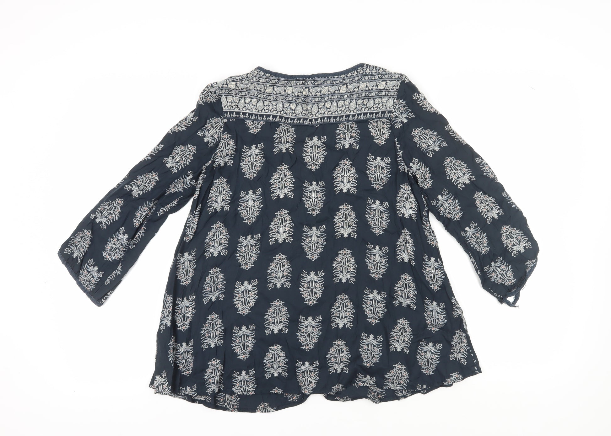 Elevate your wardrobe with this charming blue floral tunic blouse from Monsoon, crafted for women seeking both style and comfort. The intricate embroidered floral pattern adds a touch of elegance, making it an ideal choice for casual occasions. Designed in a versatile size S, this blouse features a regular fit perfect for everyday wear during the mild seasons of spring and summer.The blouse is fashioned from 100% viscose, ensuring a breathable and comfortable experience. The 3/4 classic fitted sleeves provide a relaxed yet polished look, while the scoop neckline enhances the tunic's chic appeal. This piece is made from woven fabric, offering a durable yet soft feel against your skin.Easily machine washable, this tunic blouse is not only stylish but also convenient for your busy lifestyle. The embroidered accents add to its sophisticated allure, making it an attractive option for a day out with friends or a casual work setting.Whether paired with jeans or a sleek skirt, this Monsoon blouse offers versatility and flair to every ensemble. It's in excellent condition with minimal wear, promising longevity in your fashion collection. Discover the joy of wearing this breathable, stylish tunic and make it a staple in your wardrobe today.