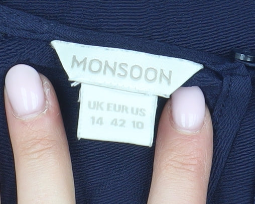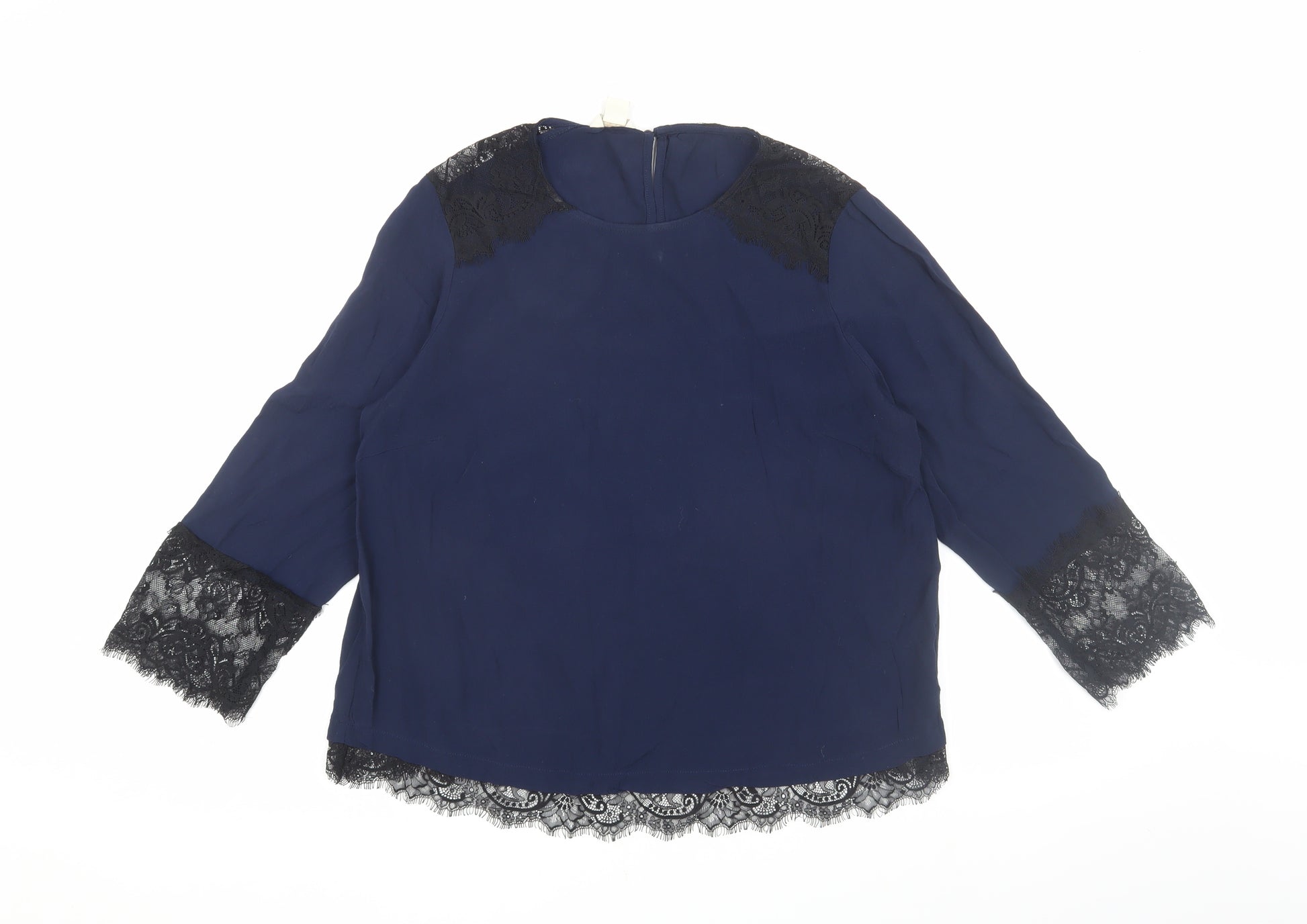 Introducing the Monsoon Women's Blue Lace Accent Blouse in Size 14, a quintessential piece for refined style and timeless elegance. This blouse, crafted with 100% viscose, offers an ultra-soft touch while maintaining a luxurious drape that lends sophistication to any outfit. The rich blue hue complements a wide range of styles, making it an ideal choice for various occasions. Intricately designed with lace accents on the shoulders and cuffs, this blouse boasts a unique flair that enhances its formal appeal. The 3/4 length sleeves and classic round neck add to its charming look, ensuring versatility whether you're dressing for a business meeting or a formal event. The regular fit provides comfort and allows for easy movement while maintaining a polished silhouette. Carefully constructed with lace fabric on accent areas, this garment is both stylish and breathable. Hand wash only care ensures its longevity and keeps it looking pristine. Perfect for autumn and spring seasons, this blouse offers an ideal layering option under blazers or with your favourite trousers. With its seamless blend of elegance and functionality, this Monsoon blouse is a must-have addition to any sophisticated wardrobe. Available at an excellent price point, it presents a brilliant choice for the discerning fashion enthusiast seeking quality and style.