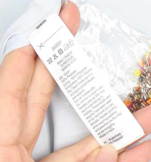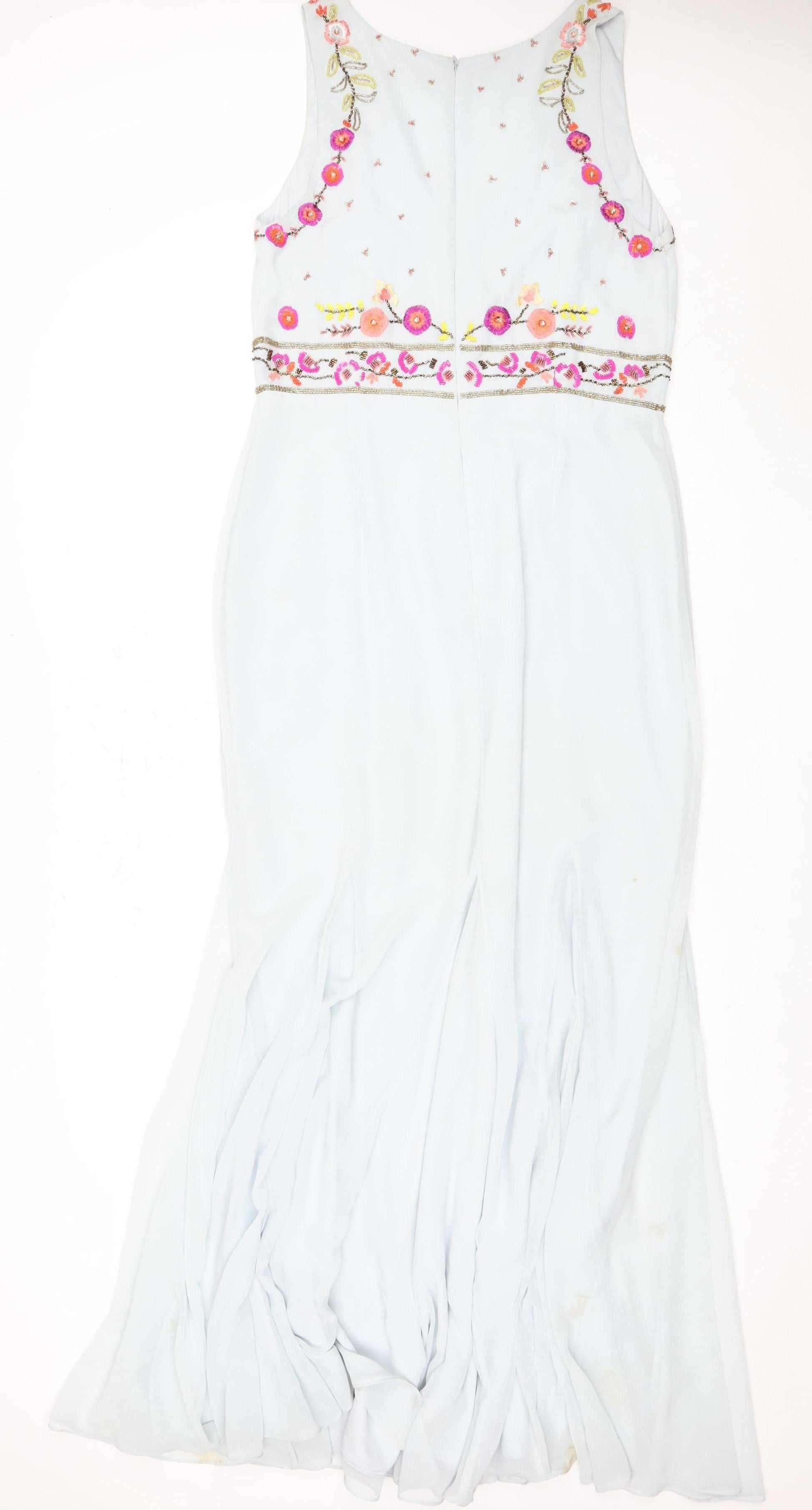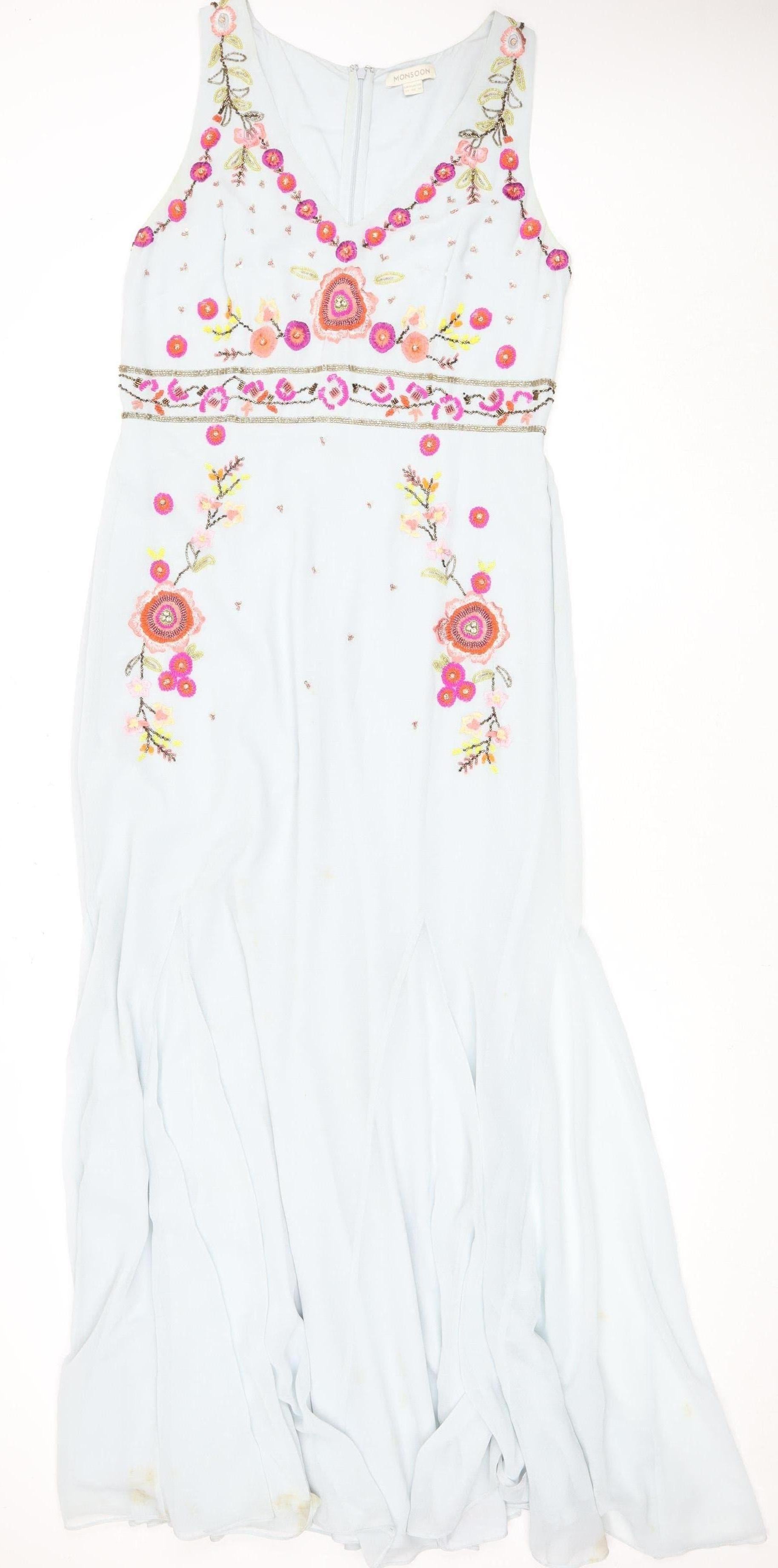 Experience elegance in this beautiful Monsoon Women's Blue Maxi Dress, perfect for formal occasions or weddings. The dress features a stunning blue colour in a long length, ideal for those seeking a graceful look. Made from chiffon, this dress offers a lightweight and breezy feel, making it perfect for spring and summer events. The sleeveless design and V-neckline add a touch of sophistication, while the embroidered and beaded accents bring an extra layer of detail. This dress is tailored for women and comes in size 14, ensuring a comfortable fit. The floral pattern and Bohemian theme provide a stylish and trendy look that fits various occasions, including beach events. Despite being in excellent condition, there are light stains visible, priced accordingly at a value of £35.00. The dress is composed of both polyester and viscose materials and requires dry cleaning to maintain its quality. Enjoy a garment that combines style, comfort, and elegance in one stunning piece.