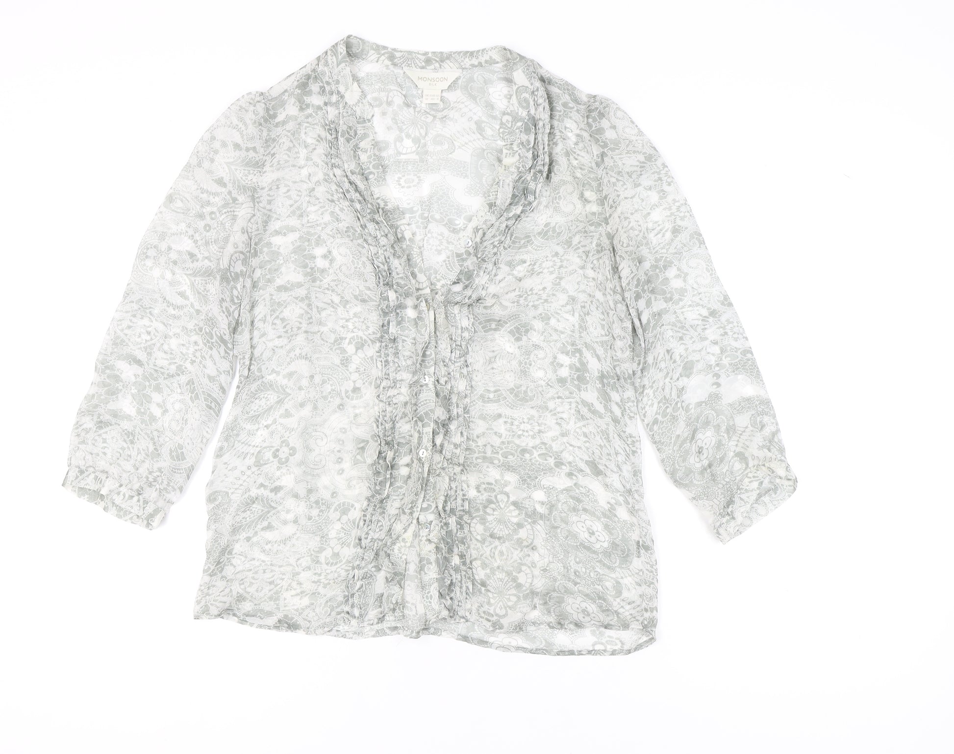 Elevate your wardrobe with this elegant Monsoon silk blouse, perfect for adding a touch of sophistication to any outfit. Designed for women, this 3/4 sleeve blouse comes in a chic shade of blue, offering a versatile addition to your clothing collection. The top is crafted entirely from silk, ensuring a luxurious feel and graceful drape. With a regular size fit of 12, it's ideal for a comfortable and flattering silhouette. Although gently worn, it remains in excellent condition with minimal signs of wear, ensuring you can wear it with confidence for various occasions. Pair it effortlessly with tailored trousers for office-ready style, or with your favourite denim for a more casual yet polished look. This Monsoon blouse is a must-have for those who appreciate quality and style in their wardrobe essentials. Don't miss the opportunity to own this beautiful piece at a fantastic price.