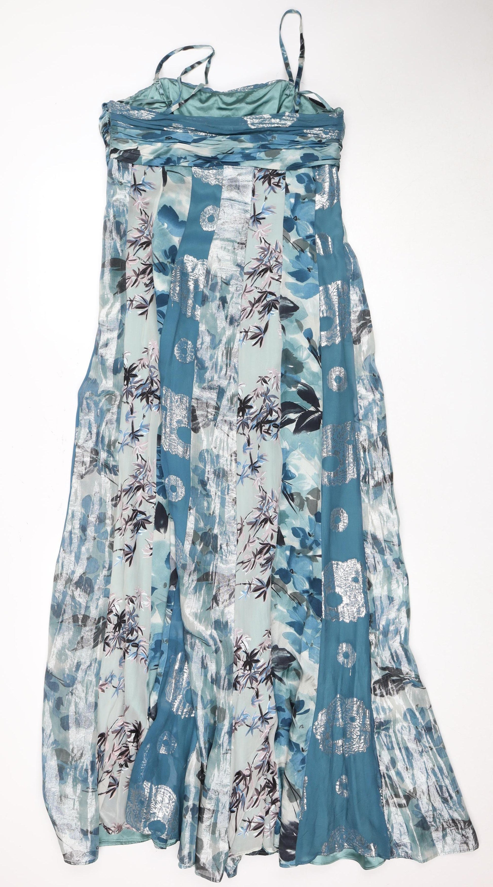 Discover elegance and sophistication with this stunning Monsoon maxi dress, perfect for those special occasions. Crafted from luxurious silk, the dress features delicate patches of floral and abstract patterns in a harmonious blue palette. The sleeveless, strappy design combined with the flowing silhouette makes it an ideal choice for spring and summer weddings or formal events. The dress is fully lined for added comfort, offering a subtle elegance that is both striking and understated. Mapped for the UK size 14, this piece provides a flattering fit for women looking to add a touch of charm to their wardrobe. Dry clean only to maintain its pristine condition. Step into your next event with confidence and poise in this exquisite dress.